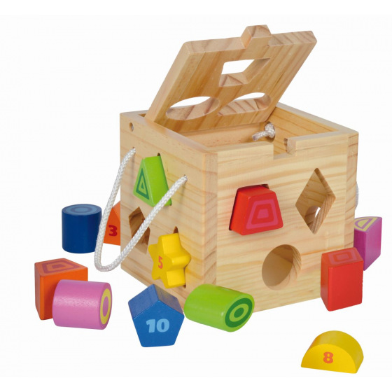 Dřevěná otevírací kostka - vkládačka, 12 různě barevných tvarů na vkládání.