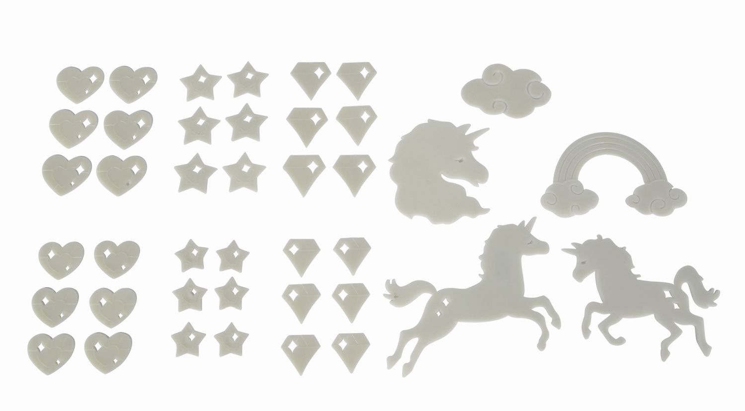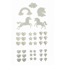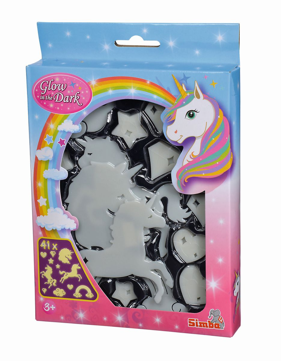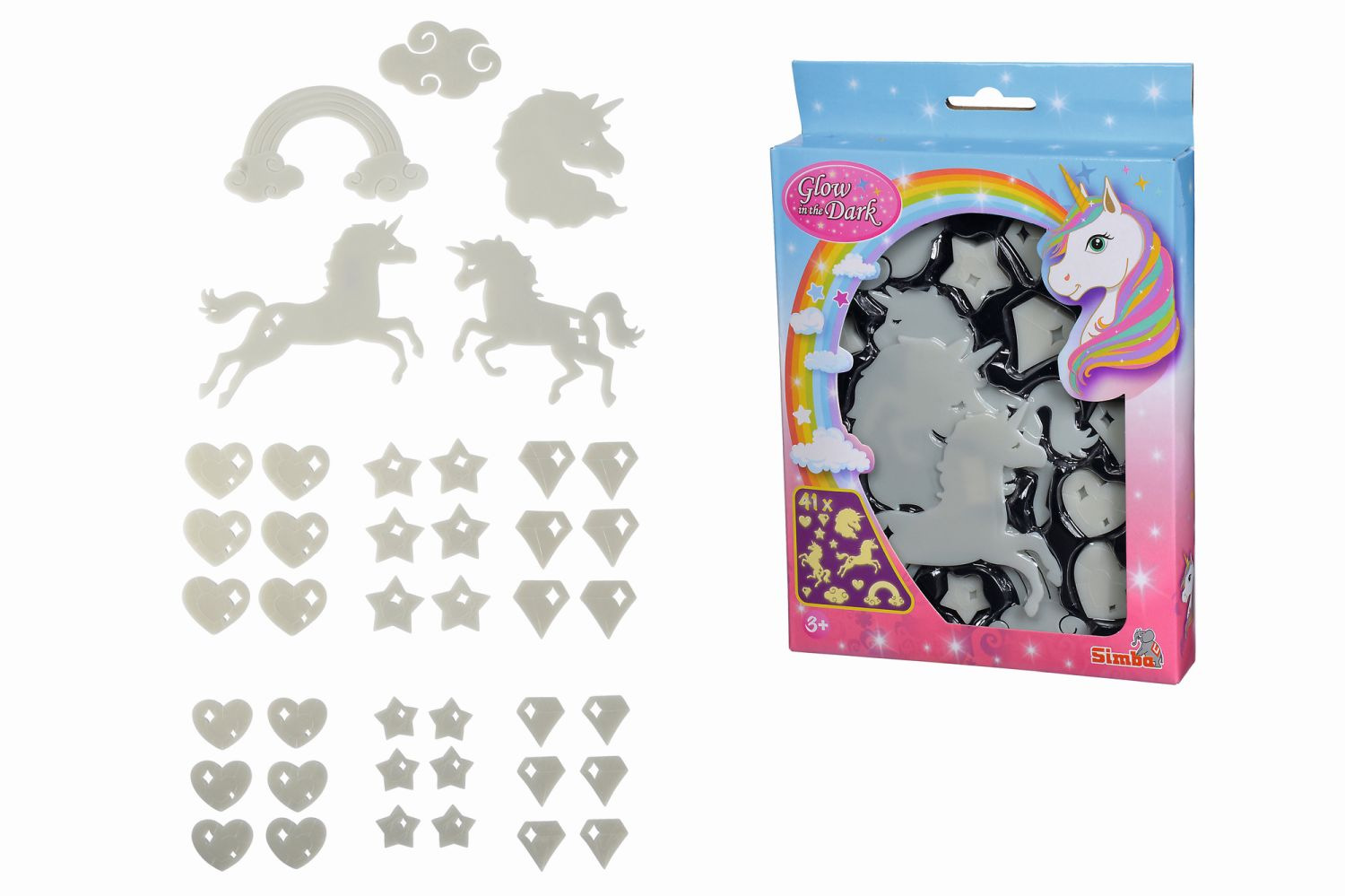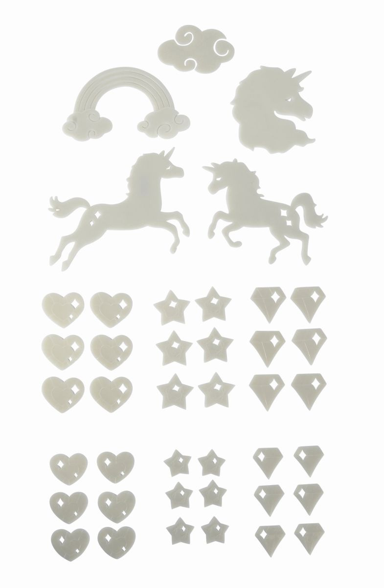 Sada fluorescenčních jednorožců a dalších motivů, které po nasvícení ve tmě svítí. Dekorace vhodná k nalepení na stěnu, strop či nábytek. Včetně lepicí gumy. Sada obsahuje 41 ks.