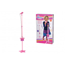 Růžový elektronický mikrofon se stojanem a se vstupem pro MP3. Nastavitelná výška 85-115cm.
