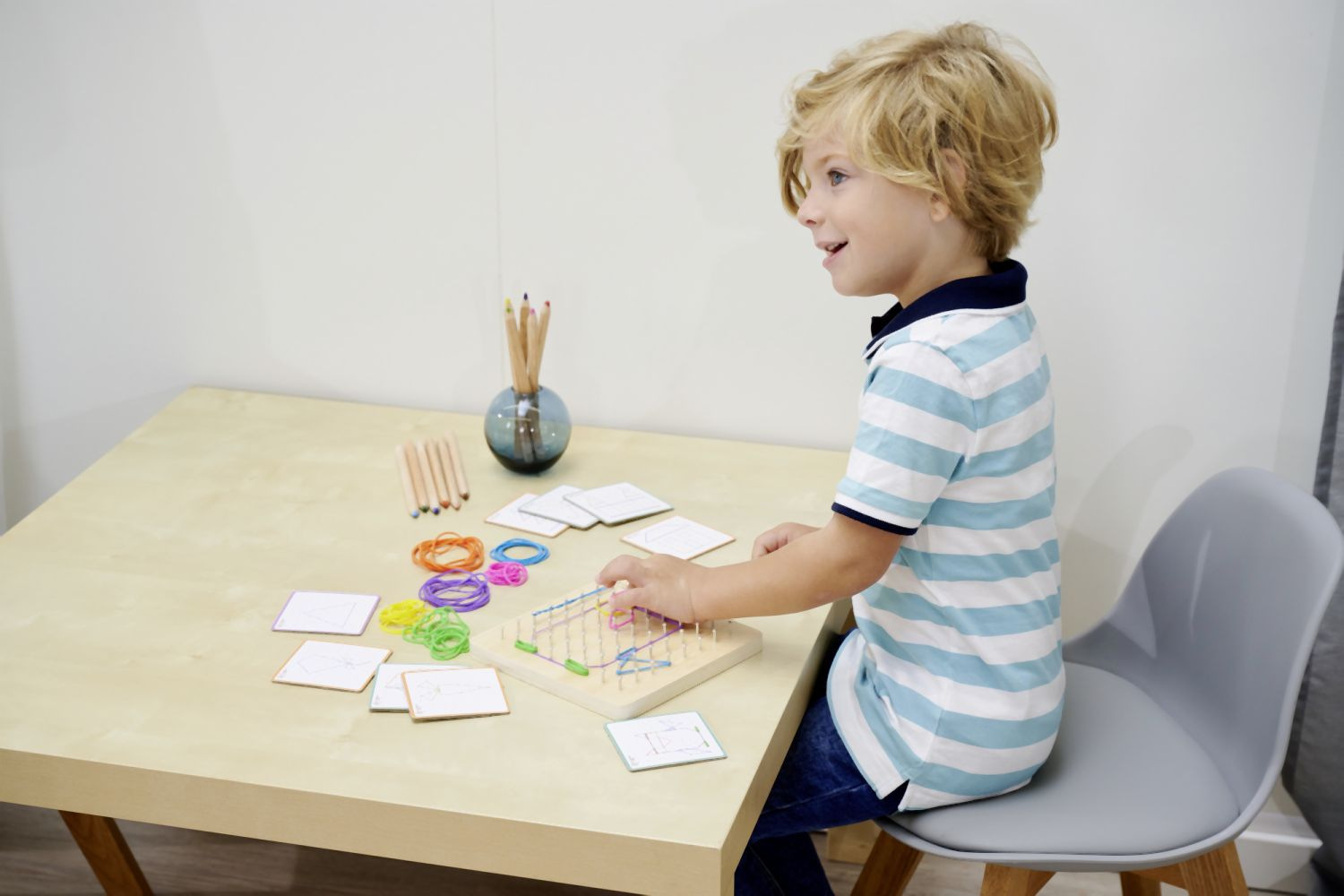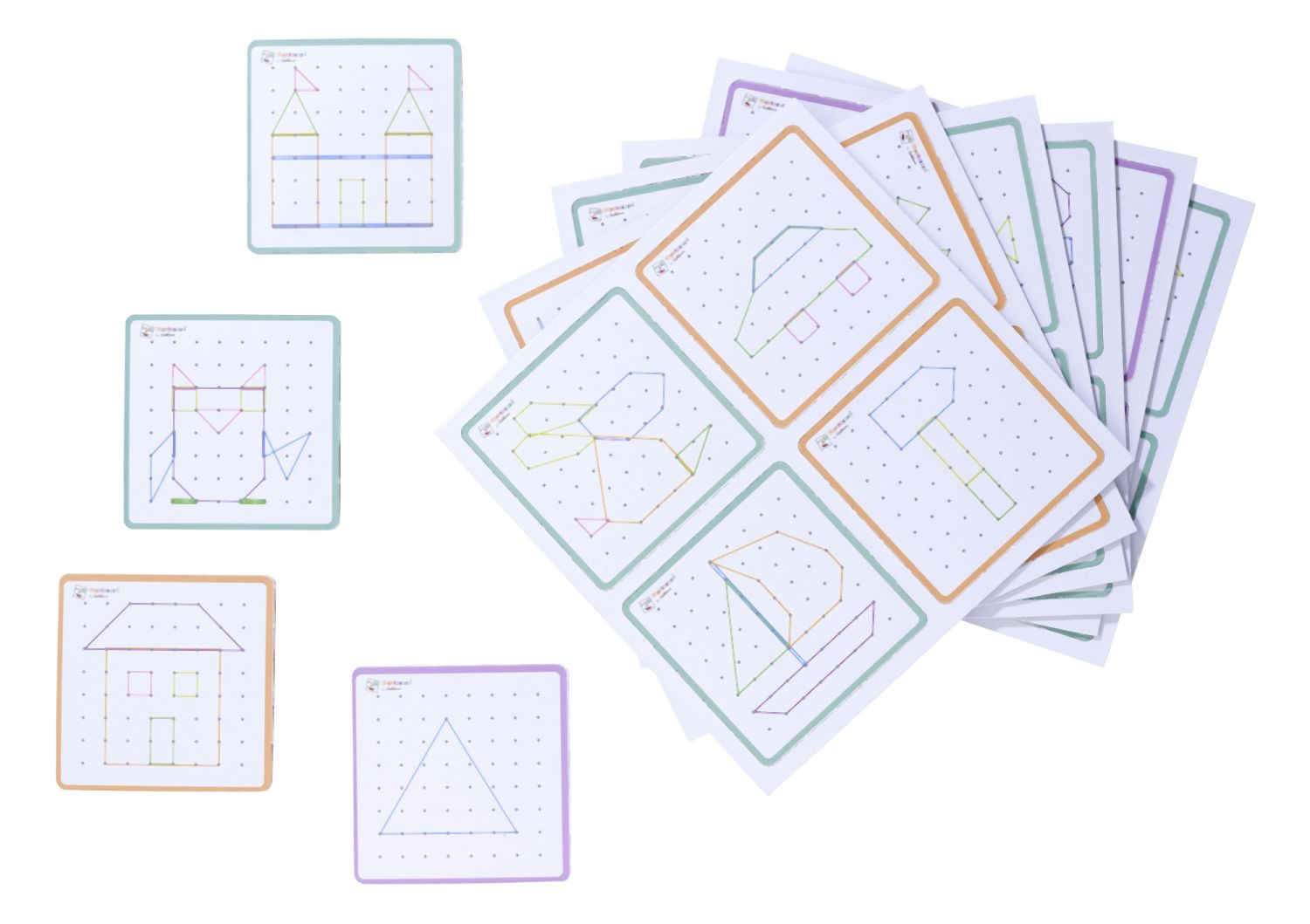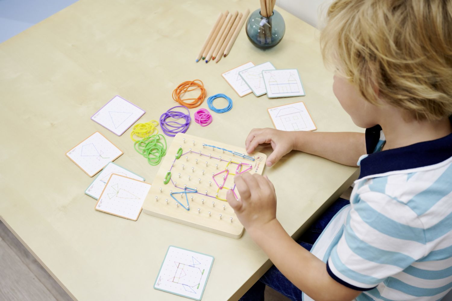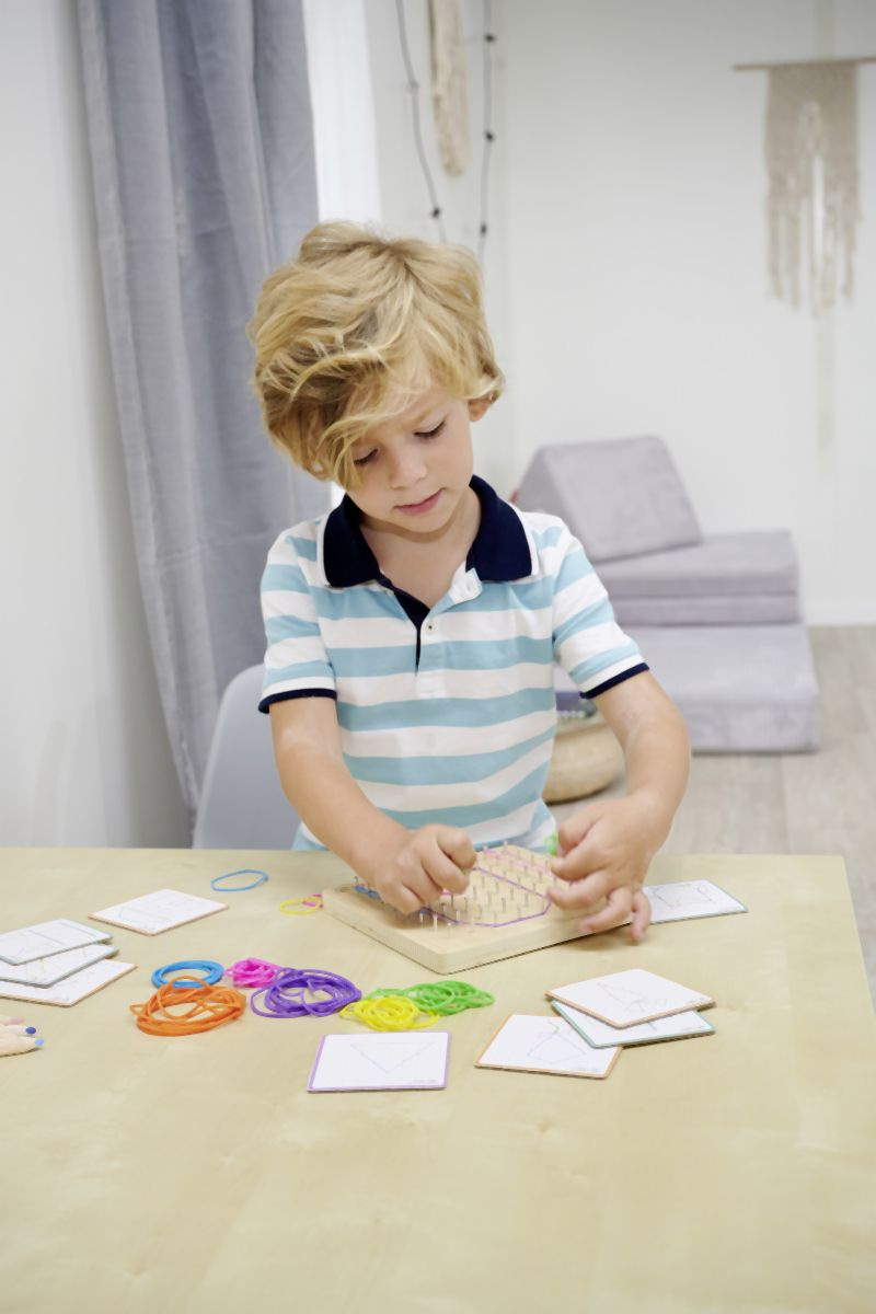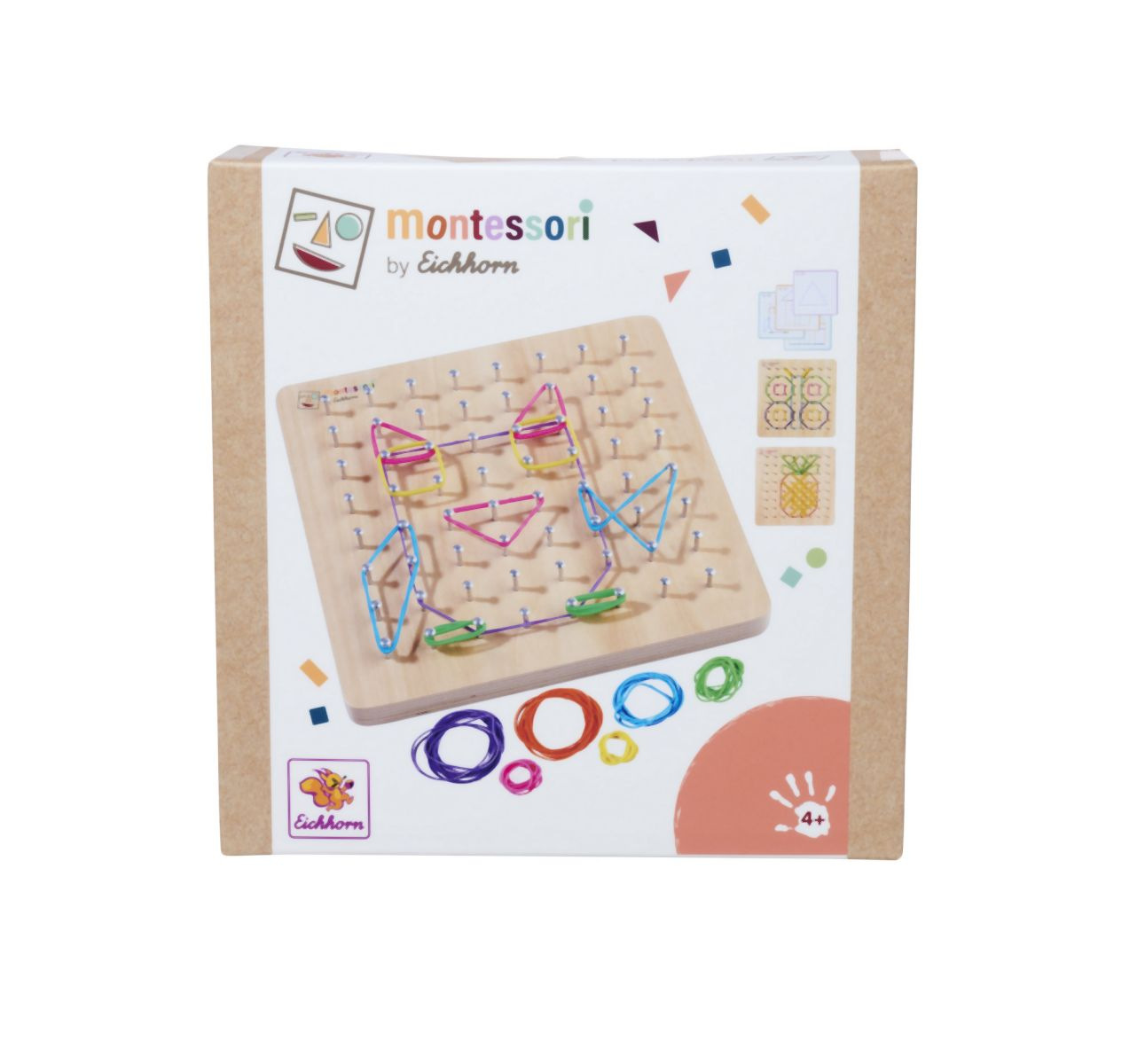 Montessori geometrická deska se 64 hřebíky a 60 barevnými gumičkami je skvělá sada pro podporu jemné motoriky a kreativity. Vaše dítě si může vymyslet postavičku podle svého přání nebo vytvořit motiv pomocí 24 karet s úkoly s různými úrovněmi obtížnosti. Geometrická deska je praktická a lze ji vzít kamkoli – do auta, do restaurace nebo k přátelům – ideální společník na cesty. Montessori geodeska o rozměrech 18×18 cm je vyrobena ze 100% lipové překližky s certifikátem FSC a je vhodná pro děti od 4 let.