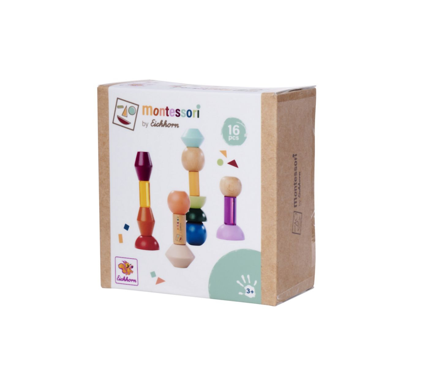 Tyto speciální geometrické stavebnice vyžadují trochu zručnosti. Ze 16 barevných stohovacích bloků můžete postavit vysoké věže a různé tvary. Vaše děti se naučí 5 nových geometrických tvarů a zamilují si dvě akrylové skleněné cihly. Bloky Montessori jsou vyrobeny ze 100% dřeva s certifikátem FSC a jsou vhodné pro děti od 3 let.