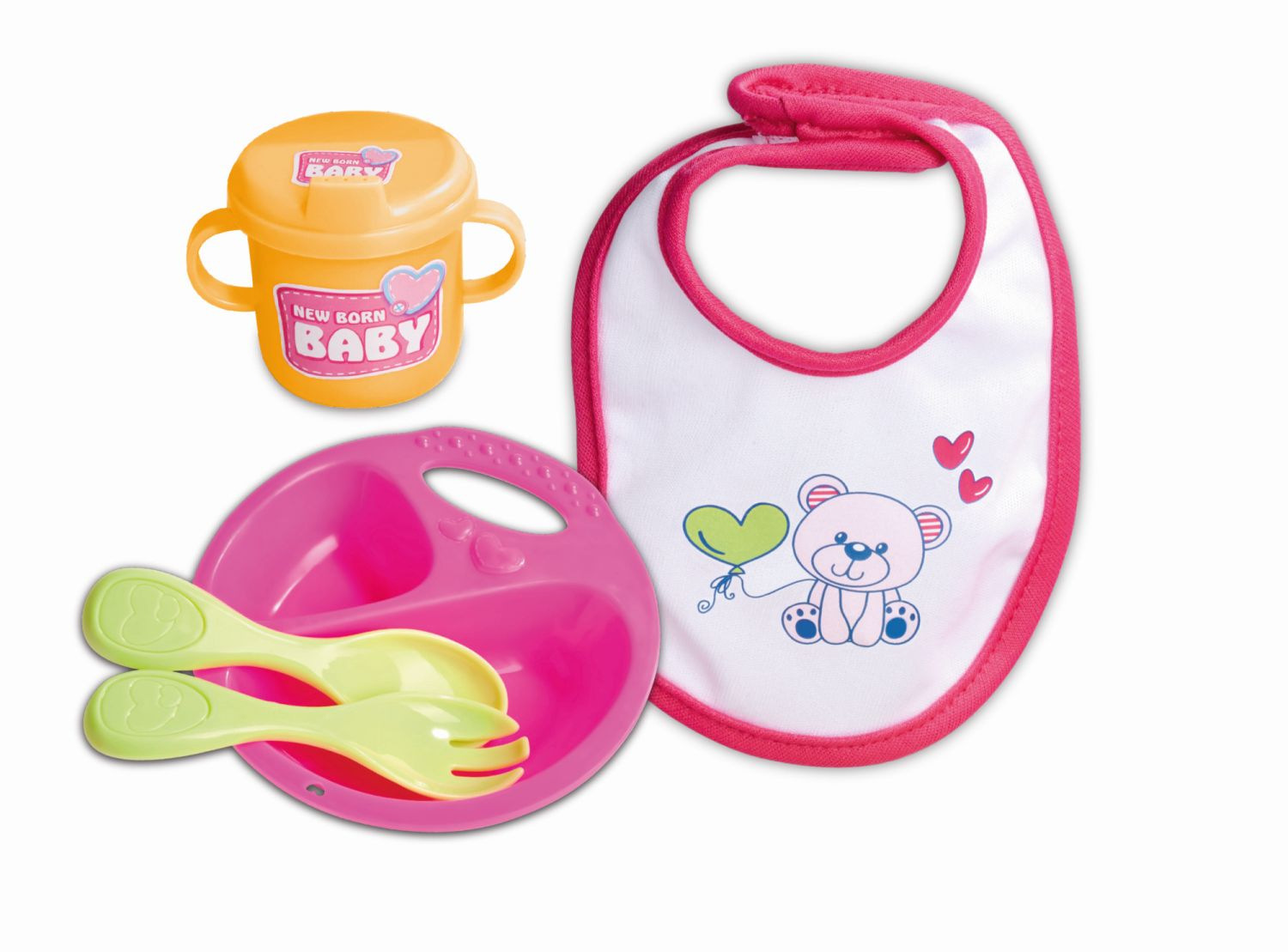 Příslušenství pro panenky obsahuje talíř, lžičku, vidličku, hrneček a bryndáček pro panenky o veliko