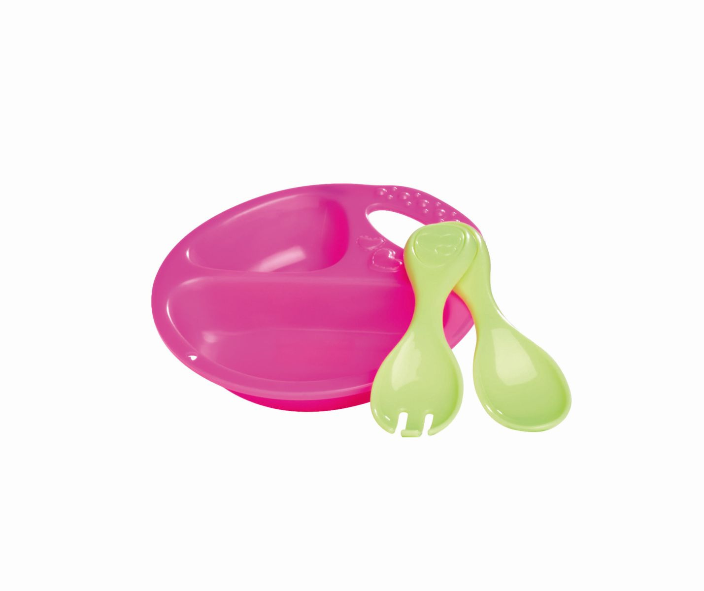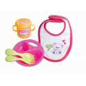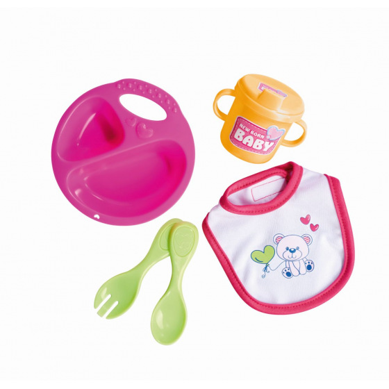 Příslušenství pro panenky obsahuje talíř, lžičku, vidličku, hrneček a bryndáček pro panenky o velikosti 30-43 cm. Celkem 5 ks.