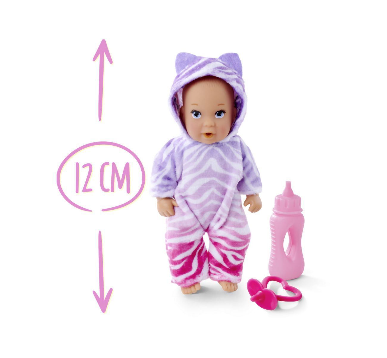 Panenka New Born Baby MINI pije a čůrá. Balení obsahuje lahvičku a dudlík. Pyžamo je ve dvou motivech - jednorožec, džungle. Výška panenky 12 cm.