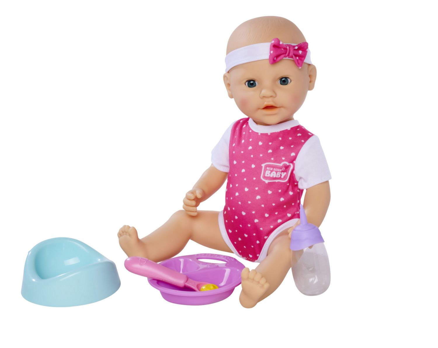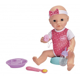 Panenka New Born Baby s plastovým tělíčkem, funkce pije a čůrá. Velikost panenky 43 cm. Součástí dudlík, nočník, plena, talířek s příborem a hrníček.