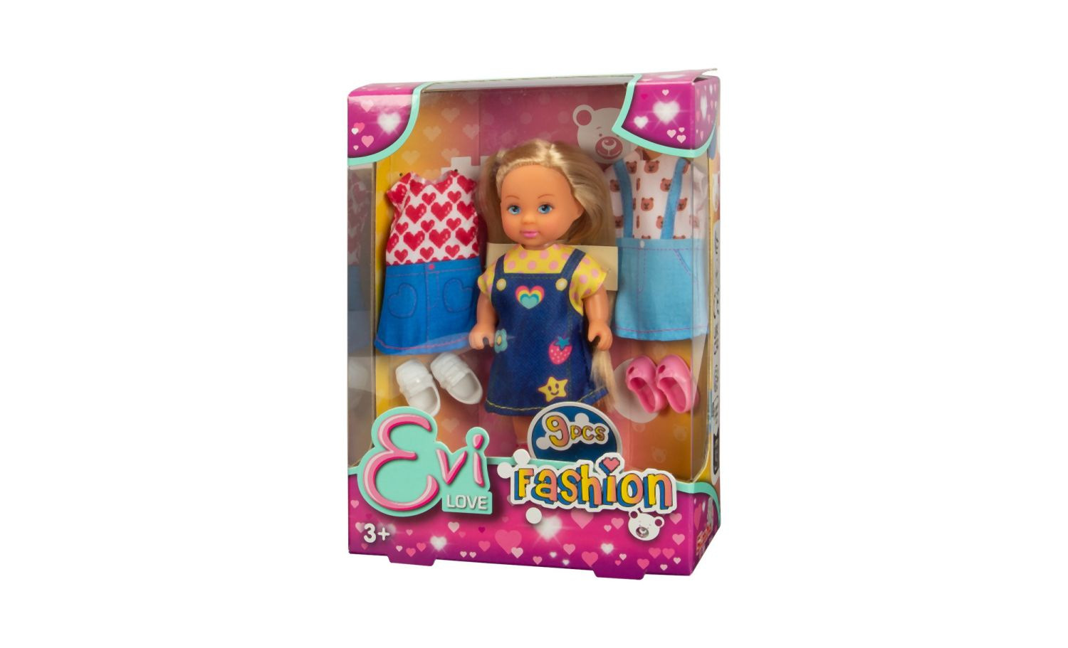 Panenka Evička oblečená v roztomilých džínových šatech. Součástí balení jsou další dva outfity s teniskami. Velikost panenky 12cm.