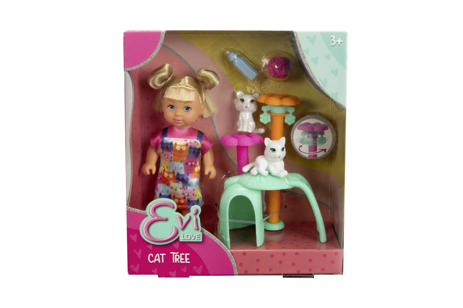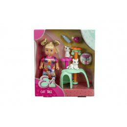 Panenka Evička oblečená v roztomilém kočičím oblečku. Součástí balení jsou dvě kočičky,škrabadlo a další doplňky. Velikost panenky 12 cm.