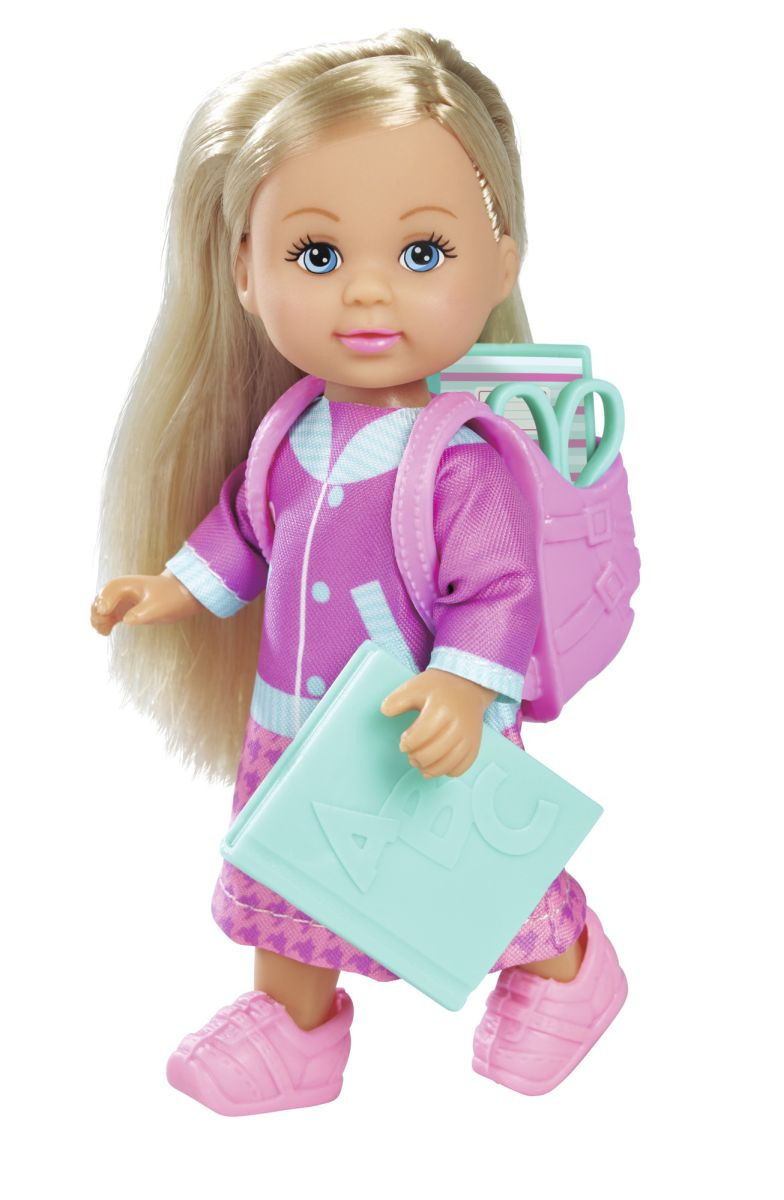 Panenka Evička a doplňky do školy - sešit, aktovka, penál, pero, nůžky, učebnice. Velikost panenky 12 cm.