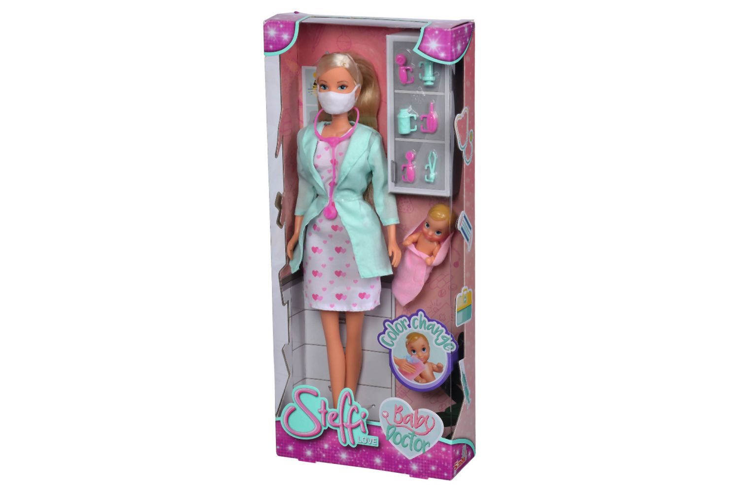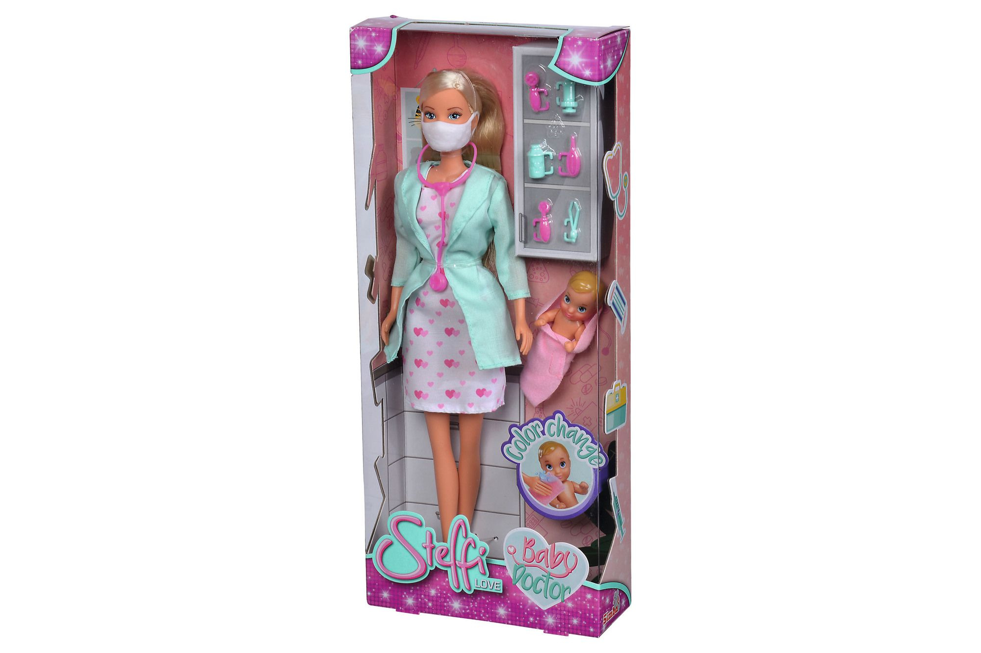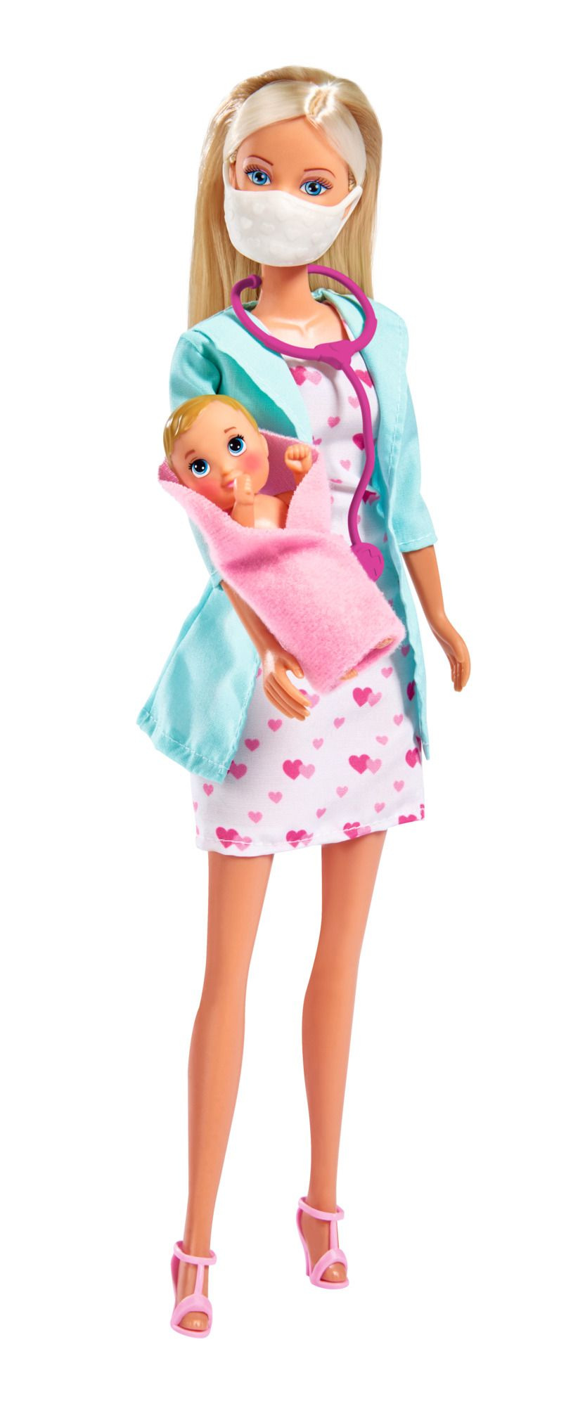 Panenka Steffi jako dětská lékařka se zdravotnickou obličejovou maskou a spoustou doplňků. Součástí miminko, kterému se při teplotě nad 31°C mění zbarvení tváří. Velikost panenky 29 cm.