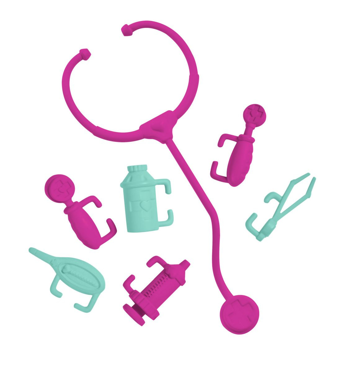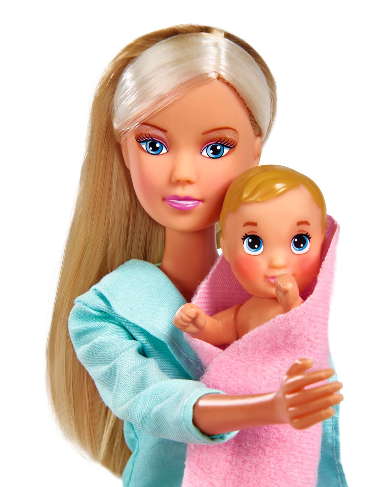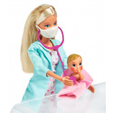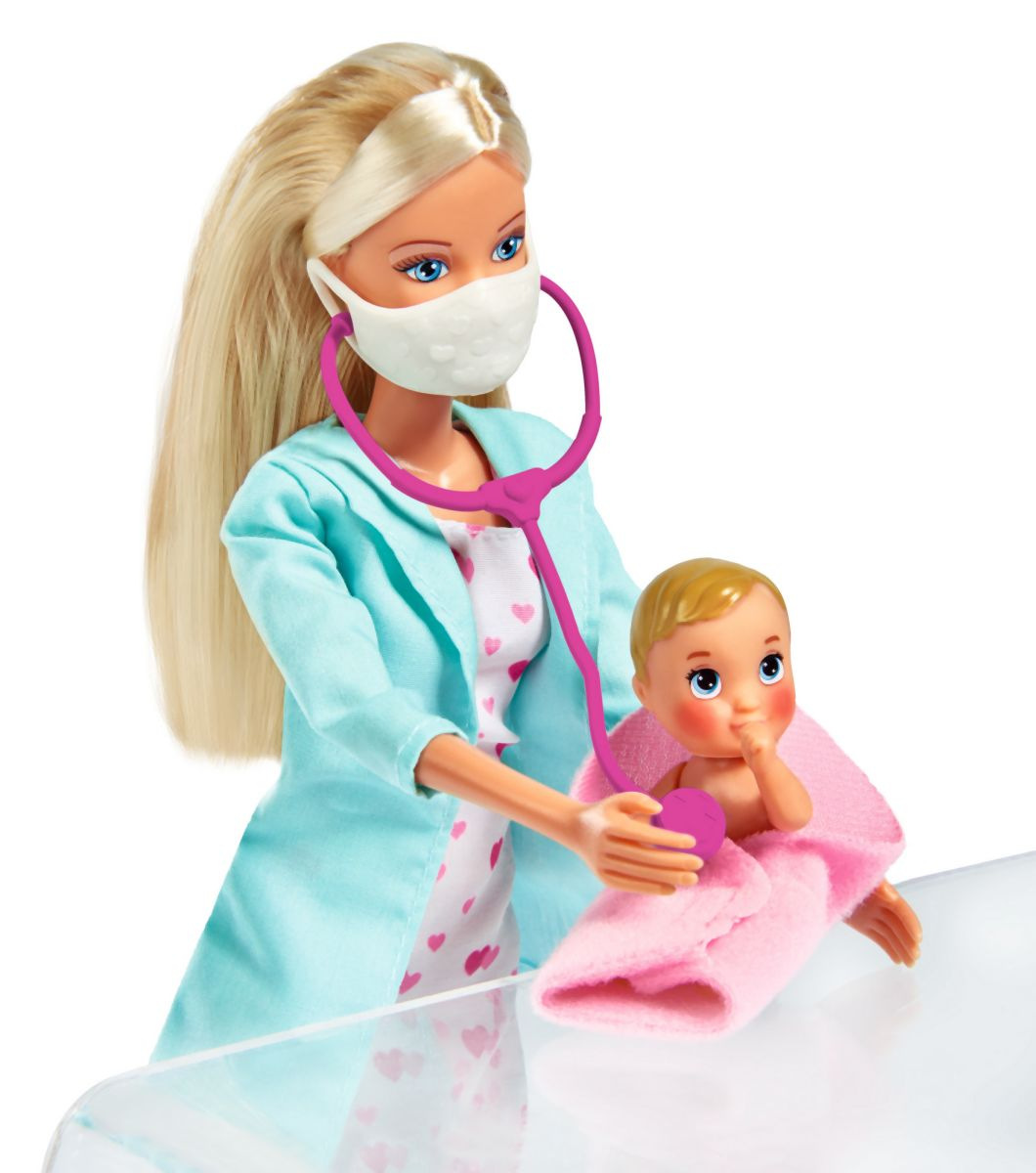 Panenka Steffi jako dětská lékařka se zdravotnickou obličejovou maskou a spoustou doplňků. Součástí miminko, kterému se při teplotě nad 31°C mění zbarvení tváří. Velikost panenky 29 cm.