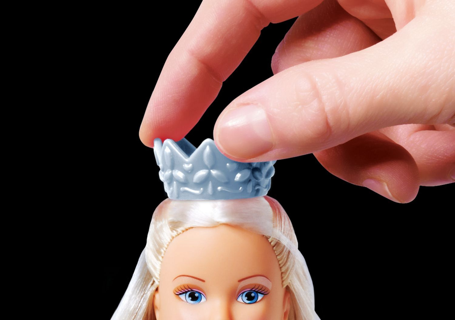 Panenka Steffi ve svatebních šatech. Otočením korunky na hlavě změníš šaty z bílých na růžové a naopak. Výška panenky 29 cm.