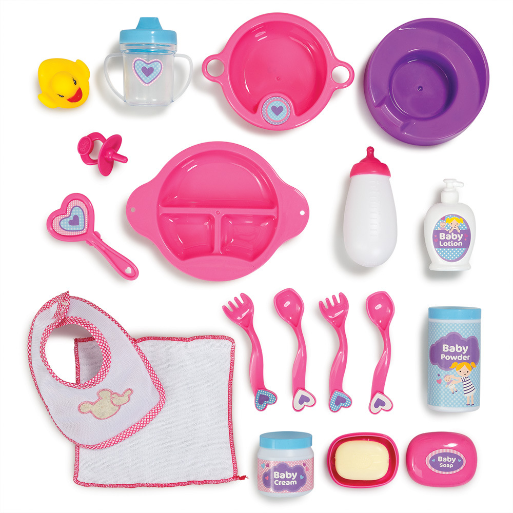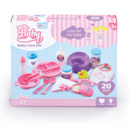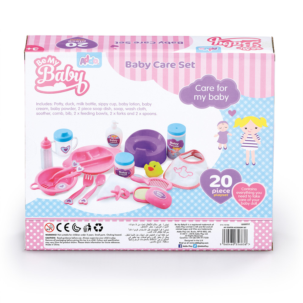 Starajte sa o svoju bábiku s touto rozkošnou 20 dielnou sadou ADDO z radu Be My Baby. Zaistite, aby bola vaša bábika čistá, umyte ju, dajte ju na nočník a namažte krémom. Potom ju učešte vlásky a pripravte niečo dobré na večeru. Sada obsahuje: 1x nočník, 1x kačička, 1x fľašu mlieka, 1x netečúci hrnček, 1x detské mlieko, 1x detský krém, 1x detský zásyp, 1x dvojdielna krabička na mydlo, 1x plastové mydlo, 1x m 1x podbradník, 2x miska na jedlo, 2x vidlička, 2x lyžica. Bábika nie je súčasťou balenia. Rozmer balenia: 30 x 25 x 6 cm. Vek: 3+
