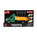 Popis Teddies Auto cestári s doplnkami plast 30cm na zotrvačník na batérie so zvukom so svetlom v krab. 33x18x13cm