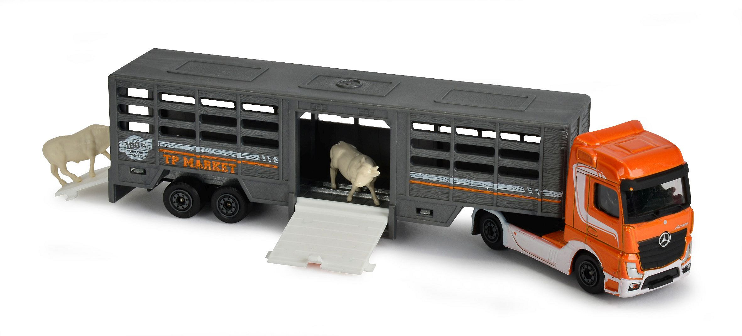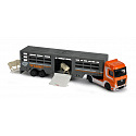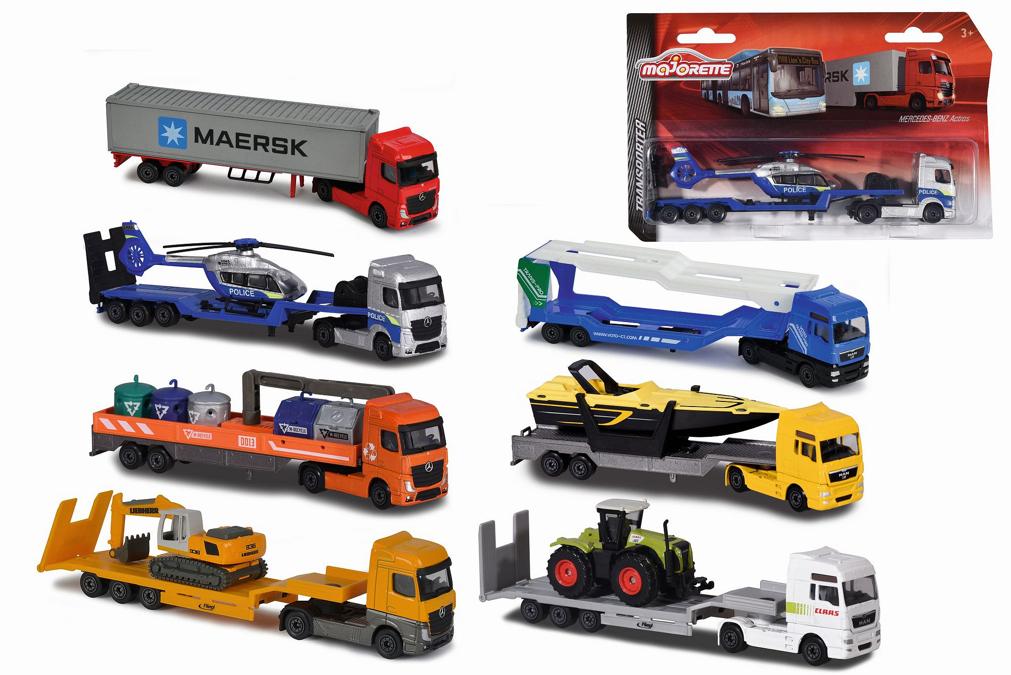 Nákladní auto s návěsem, kovové, na volnoběh, pohyblivé části. Délka cca 20 cm. Výběr z 8 druhů: autotransportér MAN TGA XXL nebo MAN TGA XXL s lodí či s traktorem, 5x nákladní auto Mercedes-Benz (pro přepravu zvířat, s tahačem Maersk, s policejní helikoptérou, s bagrem nebo s kontejnery na tříděný odpad).
