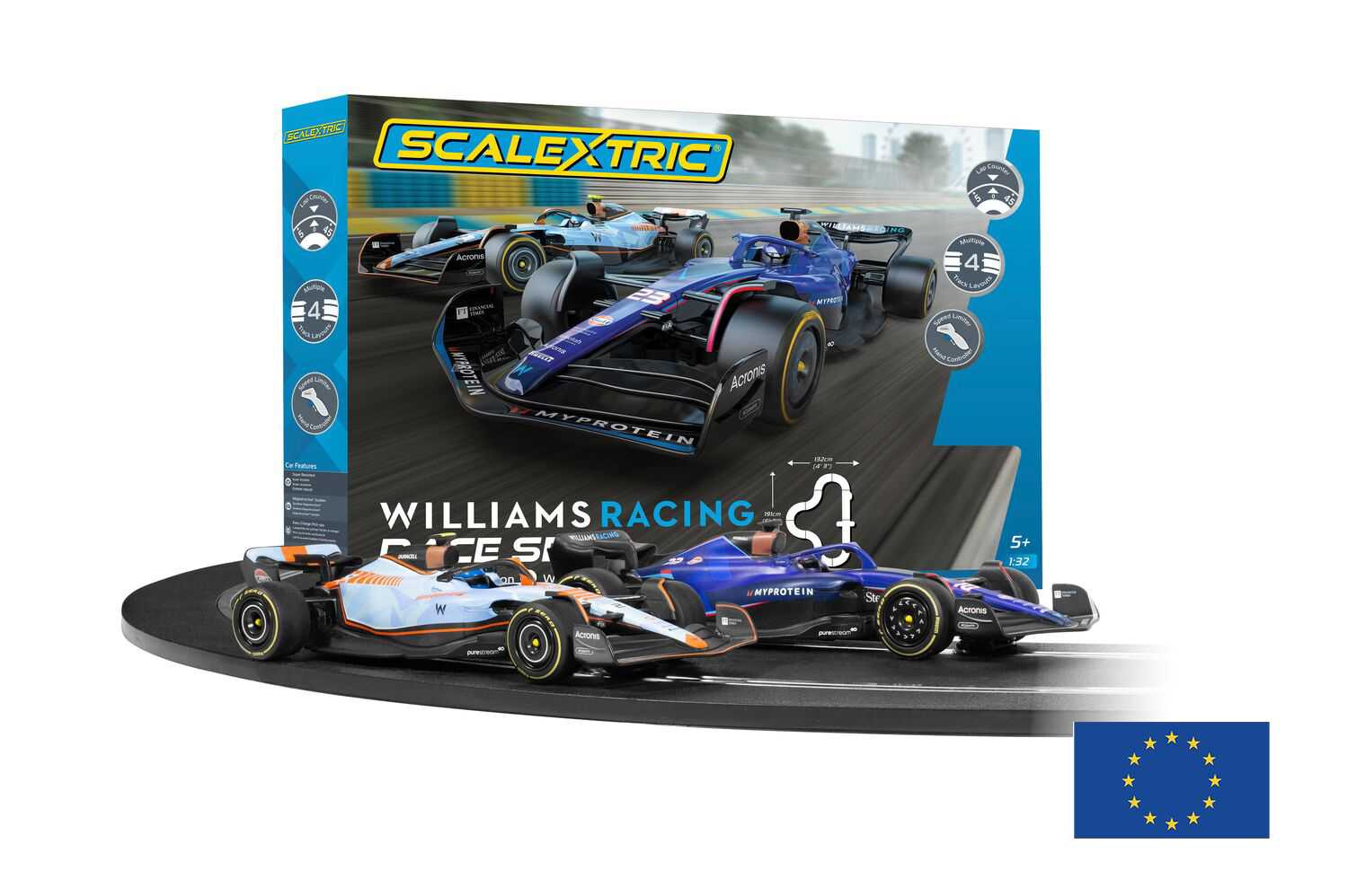 Čo nájdete v balení 1x Transformer, 1x Powerbase, 1x Lap Counter, 10x Track Pieces, 2x Hand Controllers 2x Williams FW45, 2x Track Supports, 1x Braid Pack