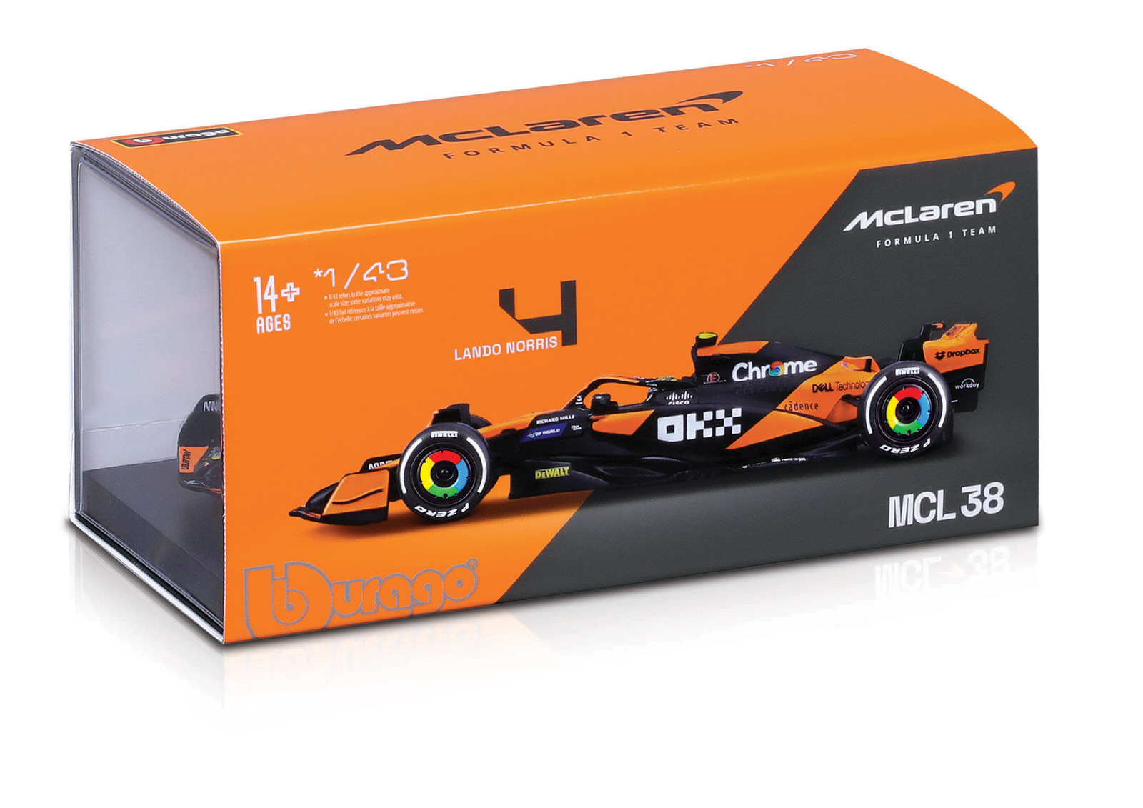 Bburago - RACE Formule F1 v dekorativním boxu, McLaren MCL38 (2024), #4 Lando Norris, 1:43