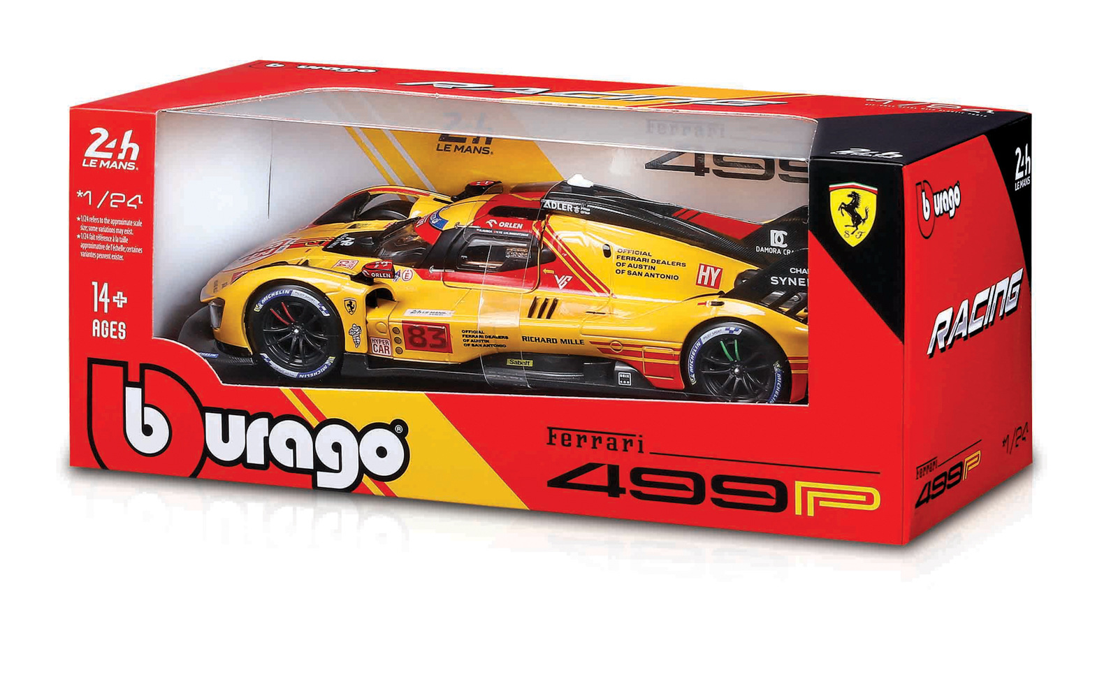 Modely závodních automobilů Ferrari v měřítku 1:24 z kolekce RACING jsou sbírkou krásného designu s vysokým důrazem na přesnost detailů. Modely jsou vyrobeny z litého kovu s plastovými detaily. Detailní provedení motorových prostor a interiéru. Většina modelů z kolekce má otevírací dveře, kufr nebo kapotu. Některé z modelů mají funkční řízení. Každý z modelů je v závodním designu a se závodním číslem. Model je namontován na výstavním stojánku. Baleno v krabičce. Nevhodné pro děti do 3 let. Rozměry balení: 10,3 x 24,5 x 12,6 cm. Věk: 14+