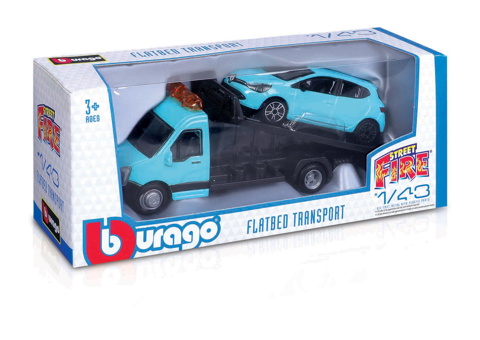 Modely automobilů Bburago v měřítku1:43 z kolekce Street Fire jsou sbírkou modelů s vysokým důrazem na přesnost detailů. Modely transportních vozidel s osobním automobilem. Modely jsou vyrobeny z litého kovu s plastovými detaily. Baleno v krabičce. Nevhodné pro děti do 3 let. Rozměry balení: 9 x 22,5 x 6,5 cm. Věk: 3+
