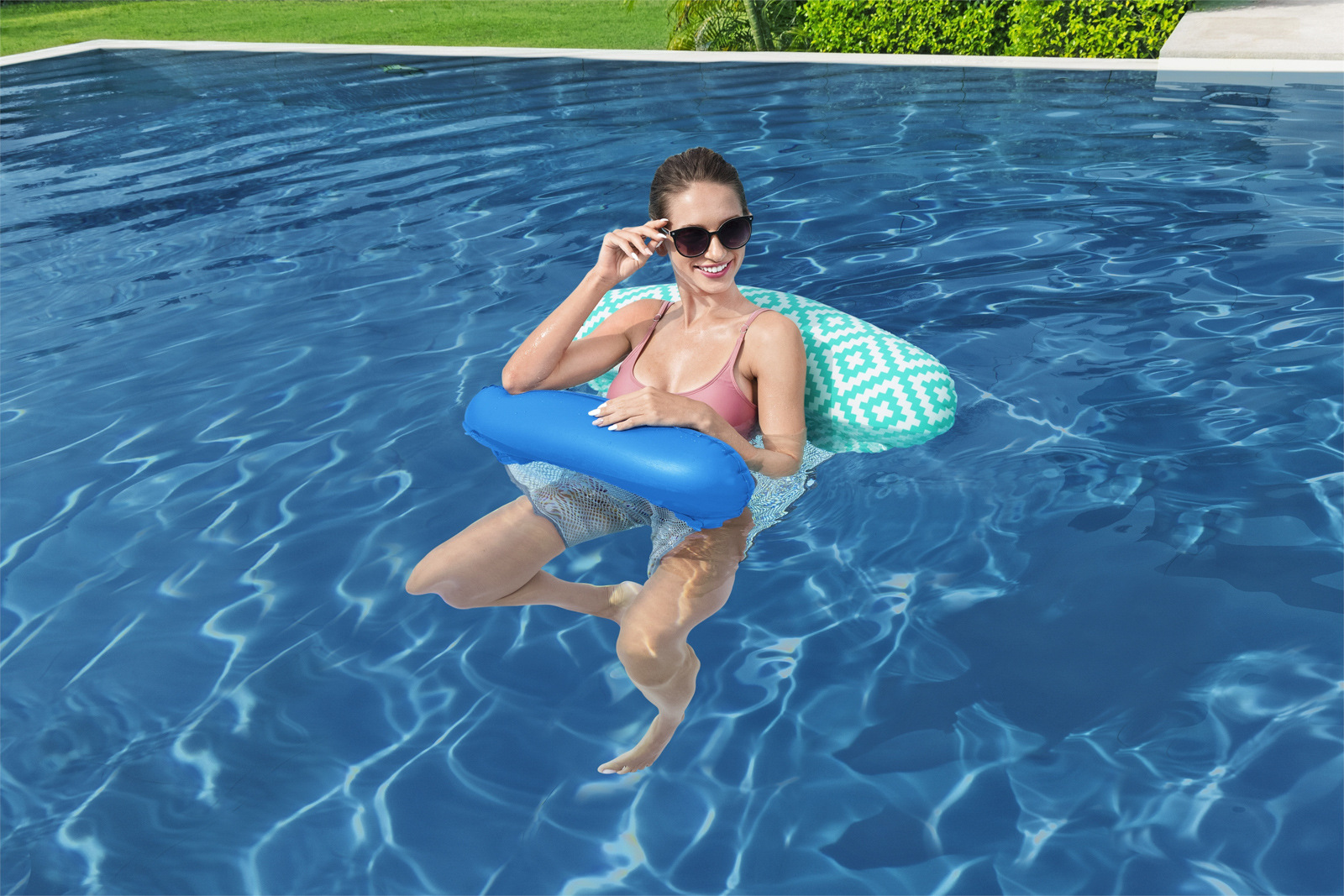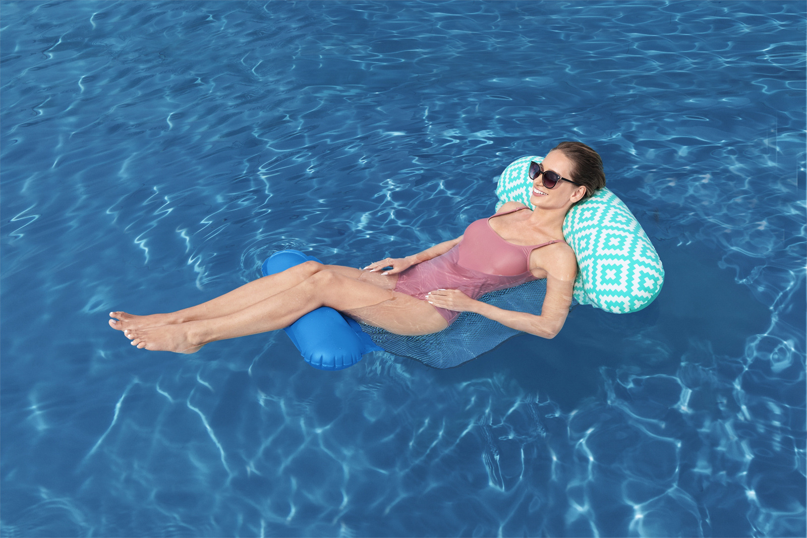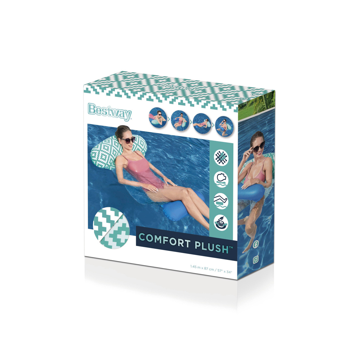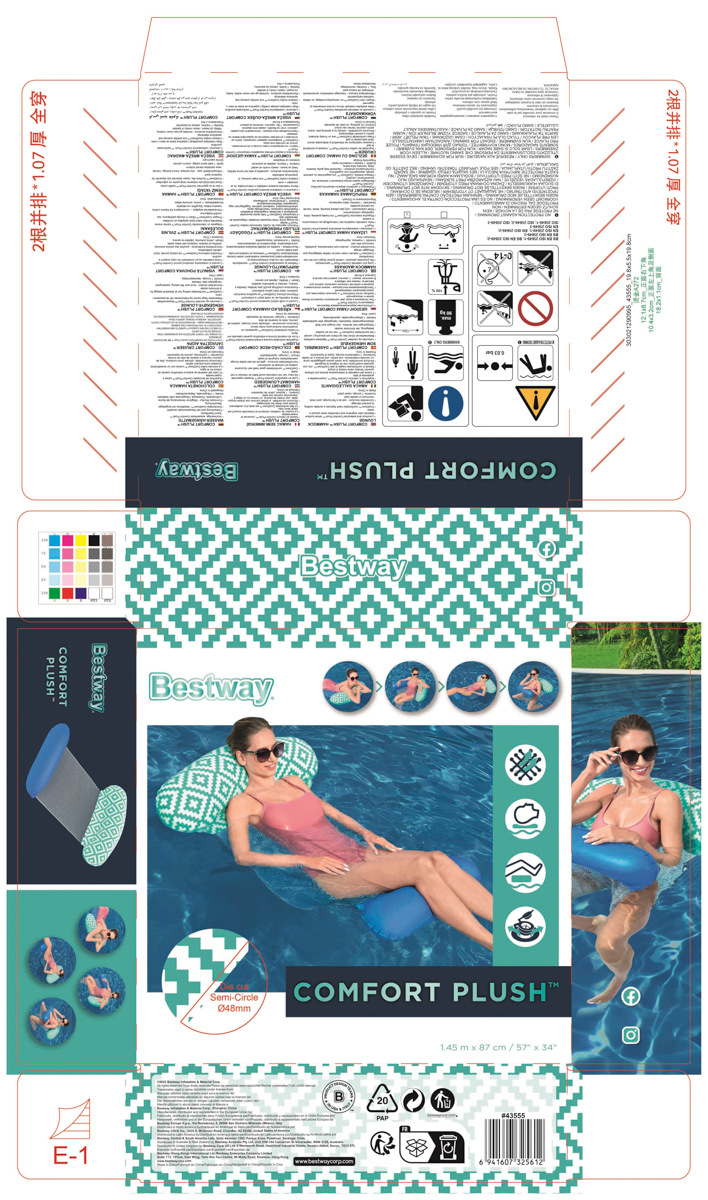 Bestway® Nafukovacie lehátko Pool Hammock Comfort Plush™. Príjemná sieťovina CoolDown™ je opatrená trvanlivým poťahom, ktorý bráni jej poškodeniu. Povrchová úprava Comfort Plush™ s nepriľnavým povrchom zabraňuje prílišnému zahrievaniu materiálu, zatiaľ čo farba materiálu sa pri kontakte s vodou stáva jasnejšou a intenzívnejšou, čo vytvára vizuálne pôsobivý zážitok. Tvárna konštrukcia – možné použitie ako rovný nafukovací matrac, bazénové kreslo, alebo hojdacia sieť. Lehátko má dve vzduchové komory a poistné ventily. Vrátane opravnej záplaty. Materiál: PVC 39%, Viskózové vlákno + PVC 35,1%, PET 25,9%. Nafúknutá veľkosť: 22 x 81 x 114 cm. Nenafúknutá veľkosť: 87 x 145 cm. Rozmery balenia: 19,8 x 19,8 x 5,5 cm. Určené pre 1 osobu. Maximálna nosnosť: 90 kg.