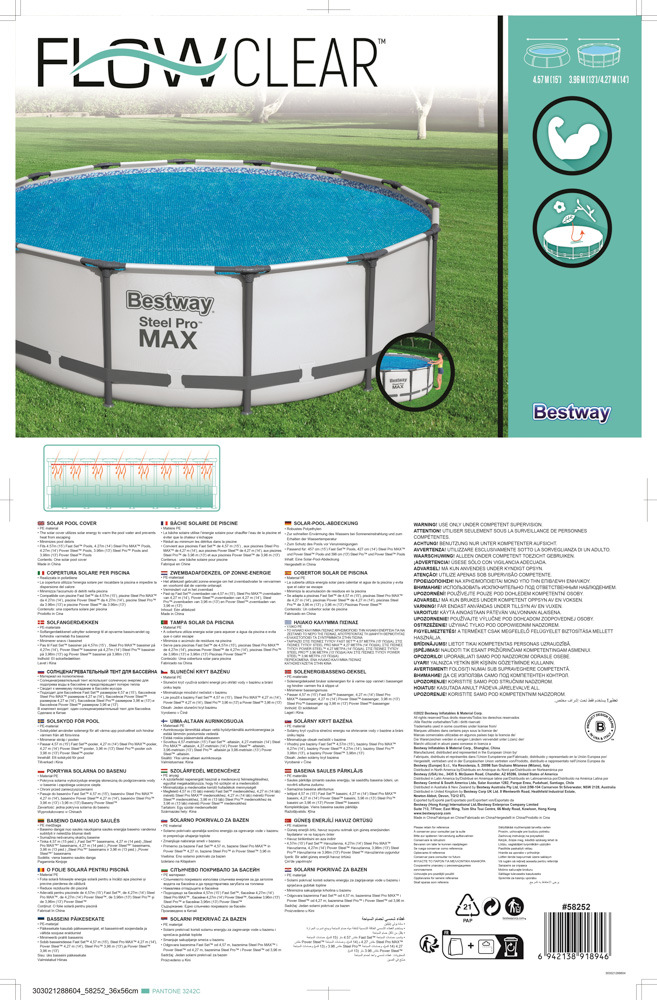 Díky této solární plachtě na kruhový bazén zabráníte vniknutí nečistot do vašeho bazénu. Sluneční plachta využívá solární energii pro ohřátí vody v bazénu a brání úniku tepla. Vhodné pro bazény Fast Set™ 4,57 m, Steel Pro MAX™ 4,27 m, Power Steel™ 4,27 m, Steel Pro™ 3,96 m a Power Steel™ 3,96 m. Materiál: PE. Rozměr krycí solární plachty: Ø 417 cm. Rozměr balení: 58 x 38 x 19 cm. Hmotnost balení: 1,27 kg.