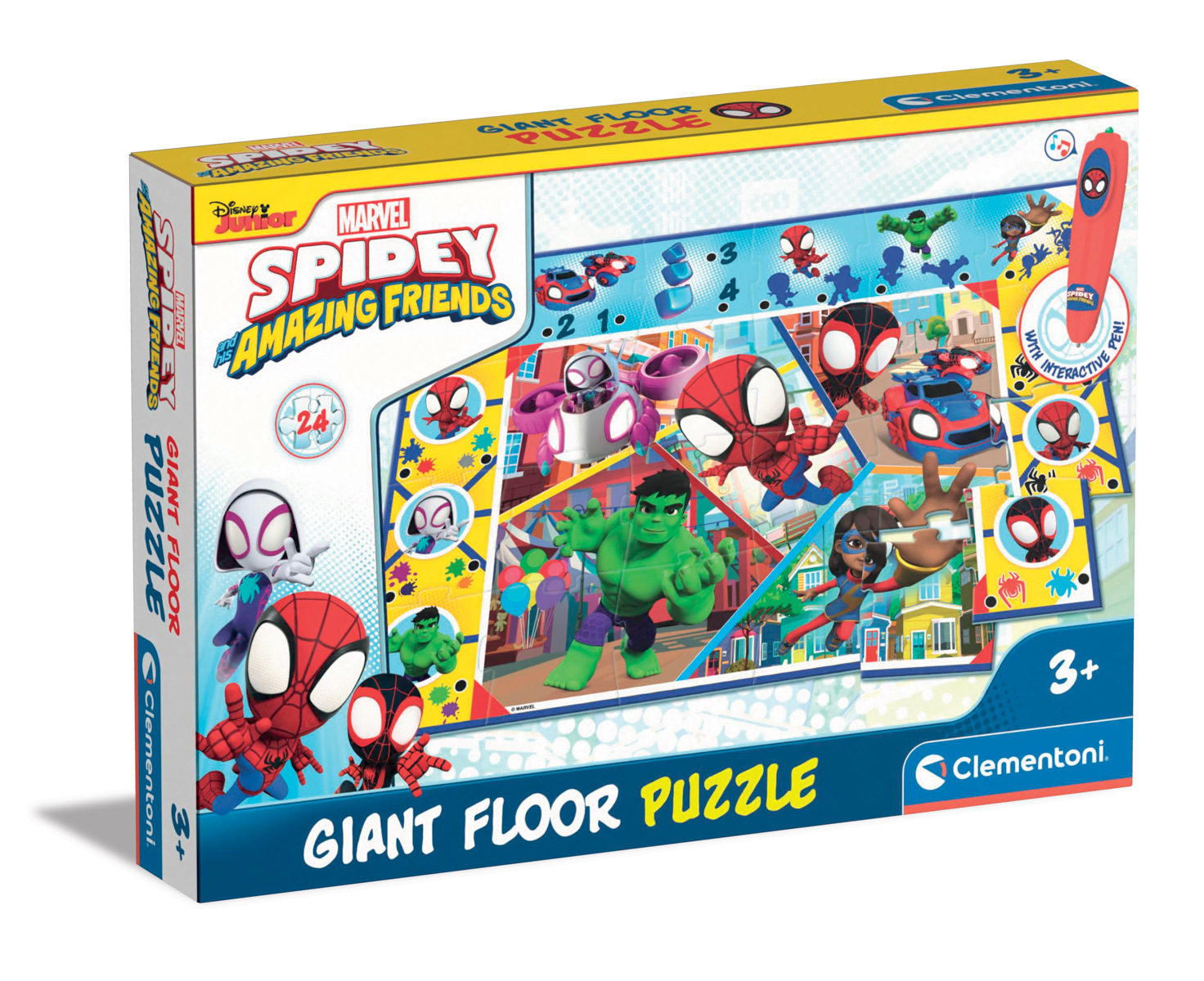 Elektronické a interaktívne 24dielne maxi puzzle, z ktorého sa po zostavení stane obria podložka s rozmermi 70 x 100 cm, ilustrovaná Spideym a jeho fantastickými priateľmi! Po zložení obrázku puzzle sa môže dieťa hrať s elektronickým perom a riešiť zábavné kvízy na typické témy predškolského veku. Vzdelávacie: učí poznávať prvé čísla, tvary a farby, okrem toho, že podnecuje logické a pozorovacie schopnosti a manuálne zručnosti. Zostavte puzzle tak, že do seba zasuniete dieliky podľa obrázku na krabici. Po dokončení vezmite elektronické pero a vyriešte kvízy okolo rámčeka skladačky tak, že pritlačíte hrot pera na čiernu bodku, ktorá je najbližšie k odpovedi, o ktorej si myslíte, že je správna. Pero vydáva zábavný zvukový efekt a LED dióda sa rozsvieti zakaždým, keď odpoviete správne. Elektrické pero má jazykové mutácie: SK, EN, IT, FR, DE, NL, ES, PT, PL. Elektronické pero funguje na 3 x 1,5 V batérie LR41/L736 (sú súčasťou balenia). Rozmery balenia: 45,1 x 31,1 x 7 cm Vek: 3+