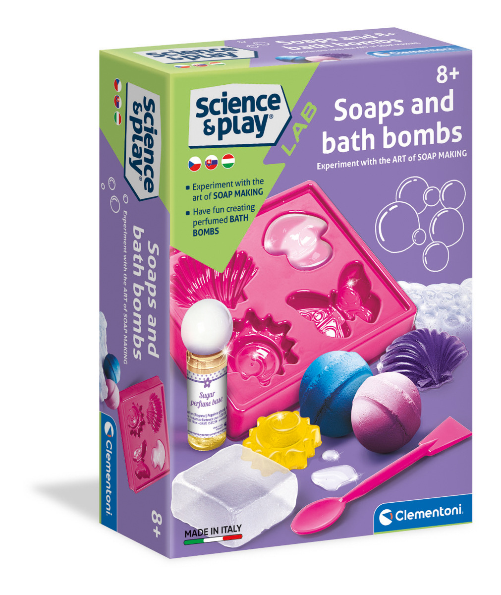 Clementoni Science&Play Laboratórium na výrobu mydiel a kúpeľových bômb. Fantastická vedecká sada pre veľa zábavy pri vytváraní skutočných mydiel a voňavých bômb do kúpeľa. Staňte sa majstrom mydlového umenia a obdarujte napríklad svojich priateľov. Obsah sady: základná voňavá zmes, mydlový základ, forma na gule do kúpeľa, špachtľa, rozprašovač, forma na mydlá s rôznymi tvarmi, pipeta, latexové rukavice. Vďaka ilustrovanému manuálu bude vaše dieťa vedené krok za krokom. Súprava pomáha rozvíjať manuálnu zručnosť a kreativitu. Jazyková mutácia CZ, SK, HU. Rozmer balenia: 21,2 x 15,2 x 5,8 cm. Vek 8+