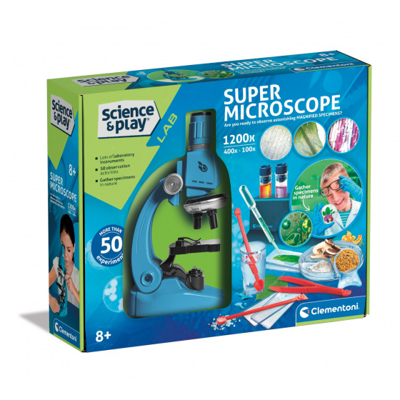 Clementoni Science & Play LAB – Super Mikroscope. Objevte fascinující mikrosvět s realistickým profesionálním mikroskopem pro děti, který nabízí až 1200násobné zvětšení (100x, 400x a 1200x). Sada obsahuje množství laboratorních nástrojů a pomůcek. S 50 poutavými experimenty je to víc než jen hračka – je to praktická cesta do zázračného světa vědy. Můžete sbírat vzorky z přírody, připravit vlastní preparáty a sledovat je pod mikroskopem. Jednoduše umístěte vzorky pod objektiv, upravte zaostřovací kolečko a prozkoumejte mikroskopický svět. Tento mikroskop je ideální pro začínající vědce od 8 let a umožňuje zábavné a interaktivní učení. Obsah balení: Mikroskop, laboratorní nástroje – pipeta, pinzeta, tyčinky, zkumavky, preparáty a další příslušenství. Baterie: 2 x AA, nejsou součástí. Baleno v krabičce. Rozměry balení: 28 x 34 x 8,5 cm. Rozměry mikroskopu: 21 x 8 x 12 cm. Věk: 8+