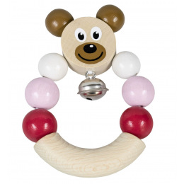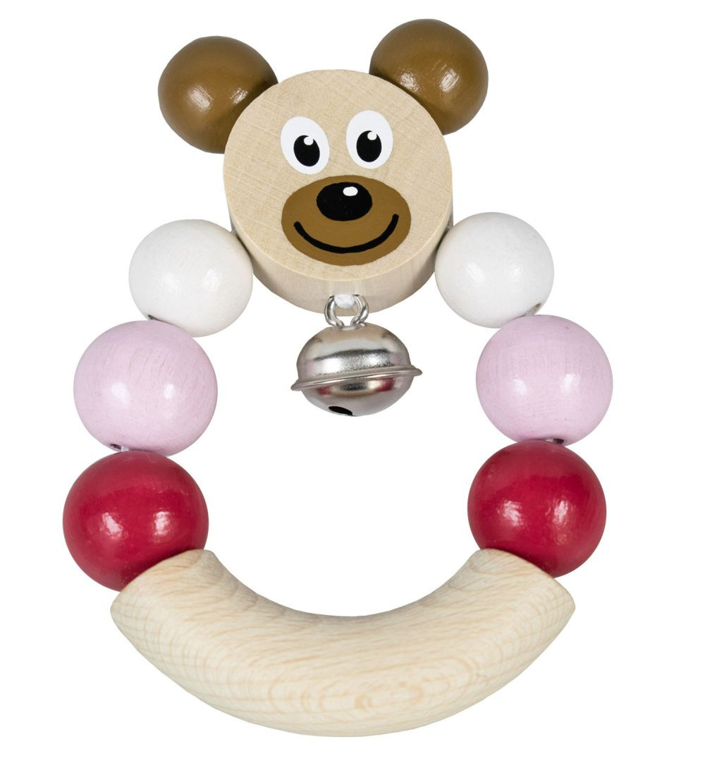 Drevená hrkálka s medvedíkom v ružovej farbe. Zvonček sa ľahko drží a jemne zvoní.Hrkálka je ľahká a
