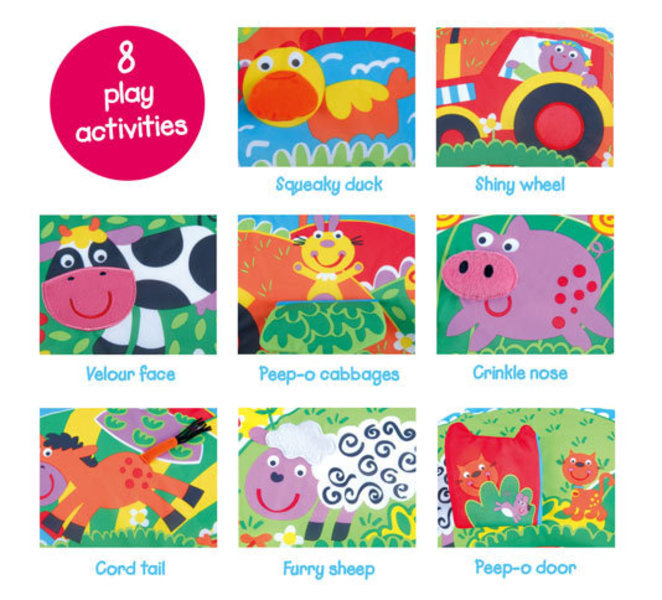 Jedinečná ohrádka s motivem farmy vhodná pro odpočinek nebo hru! Díky mnoha aktivním prvkům prožije Vaše dítě nejen fantastickou zábavu, ale také poznávání hmatových, zrakových i zvukových vjemů! Balení obsahuje nafukovací ohrádku, samostojící ramena a 4 zajímavé hračky na zavěšení do prostoru. Tato hračka v sobě ukrývá 8 aktivních prvků - vydávají zvuky či mají zajímavou texturu.