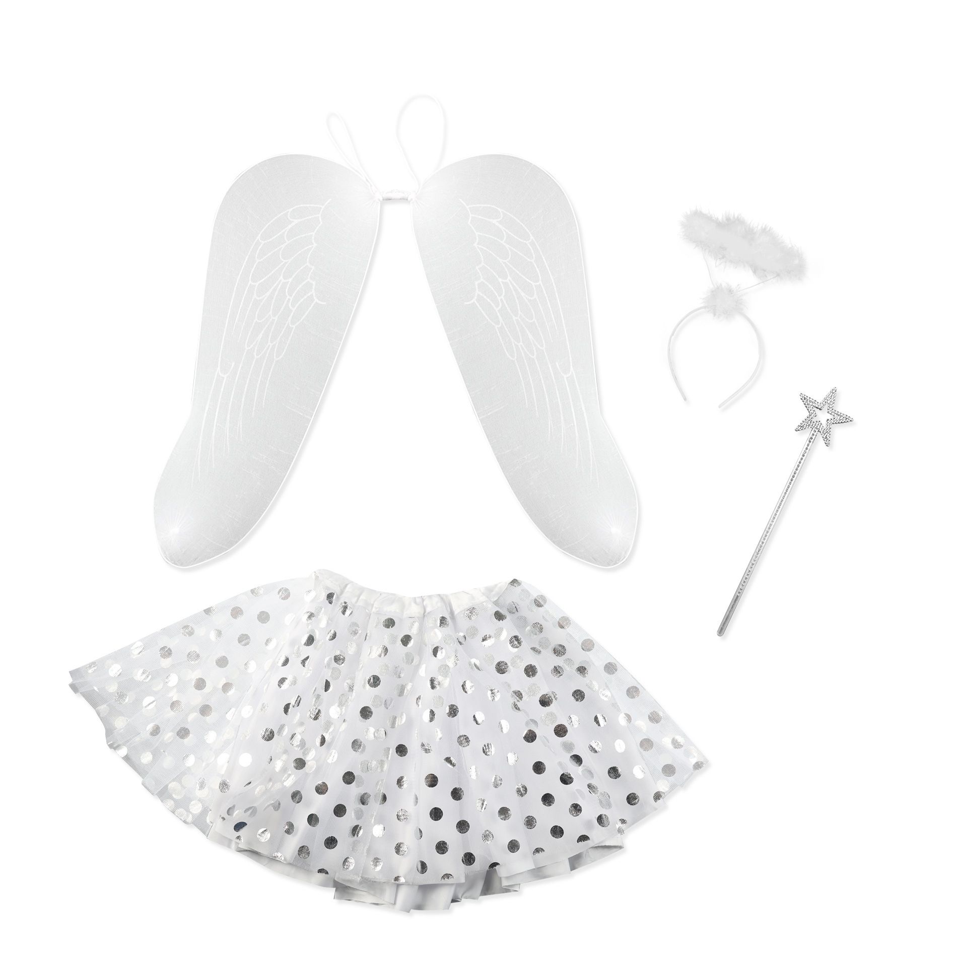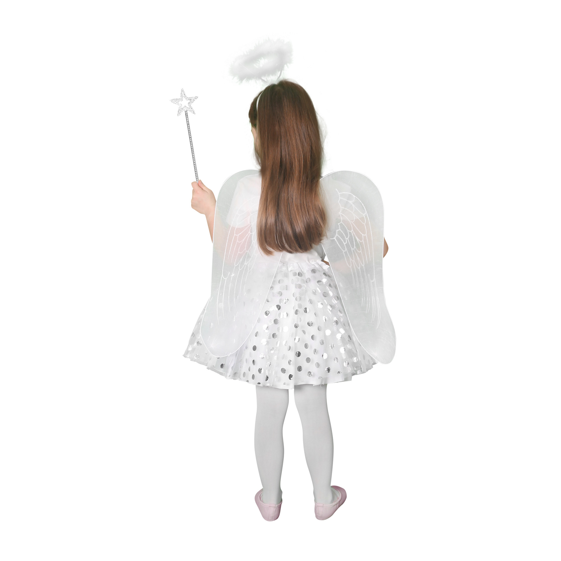 Roztomilá souprava pro všechny malé andílky! Kostýmek bílé barvy je určen pro holčičky ve věkovém rozmezí 3-7 let. Balení obsahuje nadýchanou sukničku zdobenou stříbrnými puntíky, perfektně sladěná křídla, čelenku s peřím a hůlku.