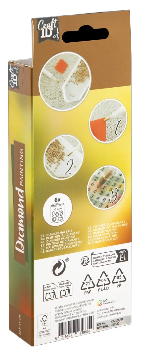 Kreativní set diamantové malování obsahuje kamínky/diamanty různých barev, aplikační pero, lepící čtvereček, tácek a předlohu. Umísti podle čísel na předloze přiřazené kamínky a vznikne ti nádherný diamantový obrázek o velikosti 18x14 cm