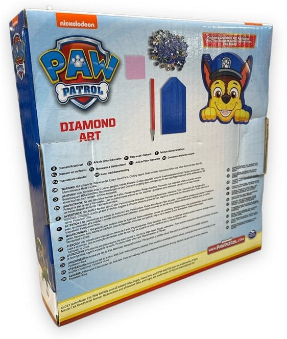 Kreativní sada diamantové malování. Pomocí nalepování malých kamínků/diamantů na předlohu si vytvoř nádherný obrázek pejska Chase z pohádky Tlapková patrola o velikosti 18x18 cm, sada obsahuje obrázek/předlohu, kamínky/diamanty, pero k aplikaci kamínků na předlohu, tácek, lepící čtvereček a návod