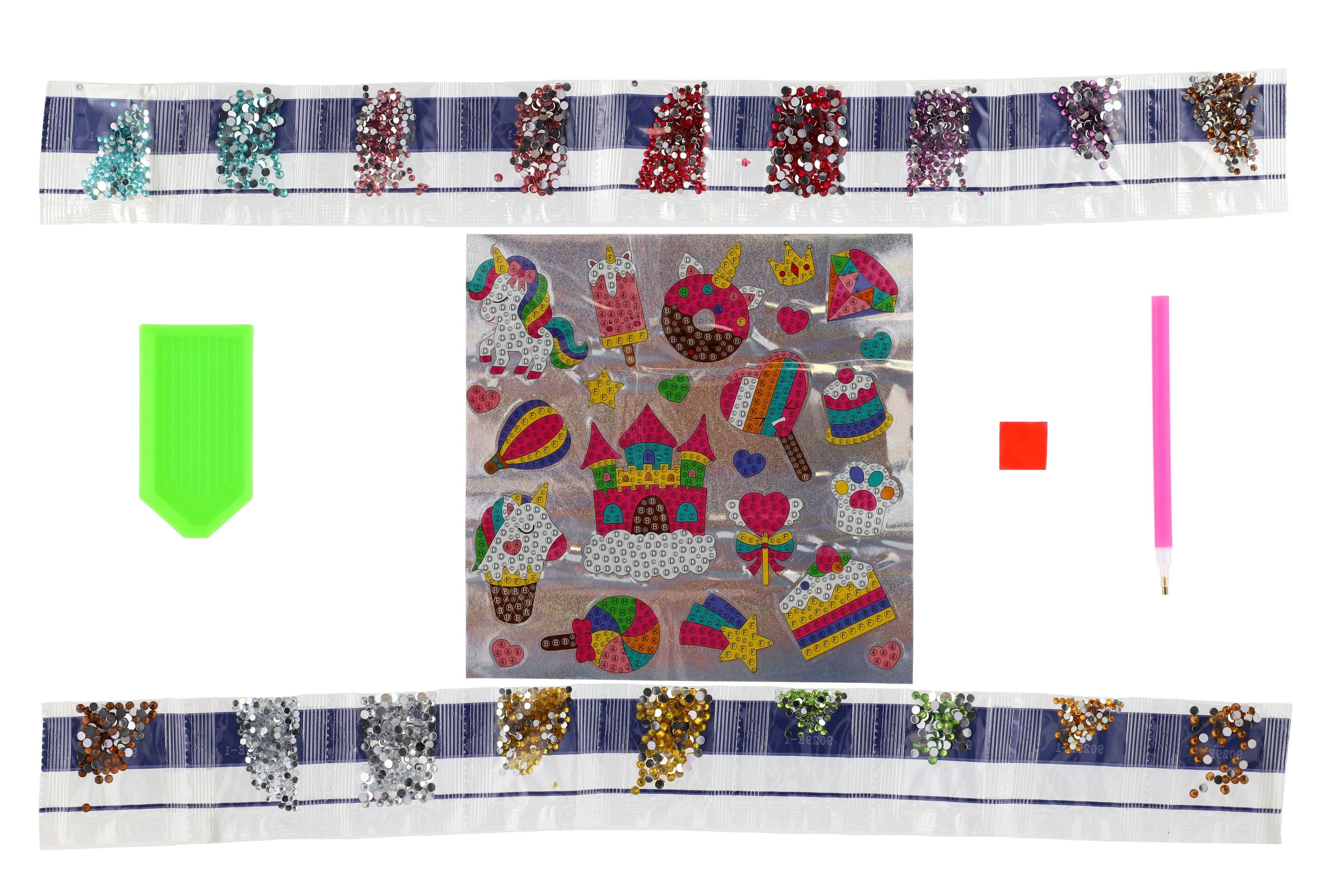 Pomocí pera přenášíte jednotlivé diamanty na lepivá místa na samolepkách. Hotové samolepky si můžete naplepit. Rozměr krabičky: 8 x 25,5 x 2,5 cm Vhodné od 3 let