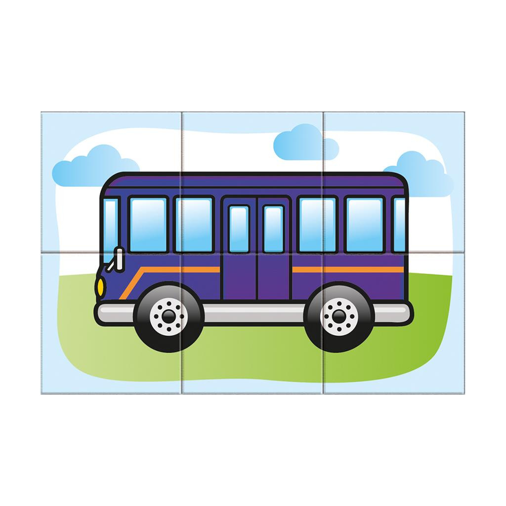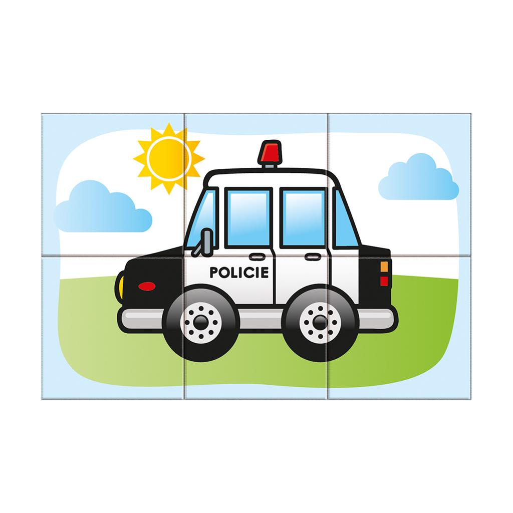 Kvalitné drevené kocky 6 kusov, z ktorých si môžete zostaviť 6 obrázkov s dopravnými prostriedkami.