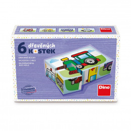 Detské drevené kocky, z ktorých sa dá poskladať 6 rôznych obrázkov. Balenie obsahuje 6 kociek. Vek: