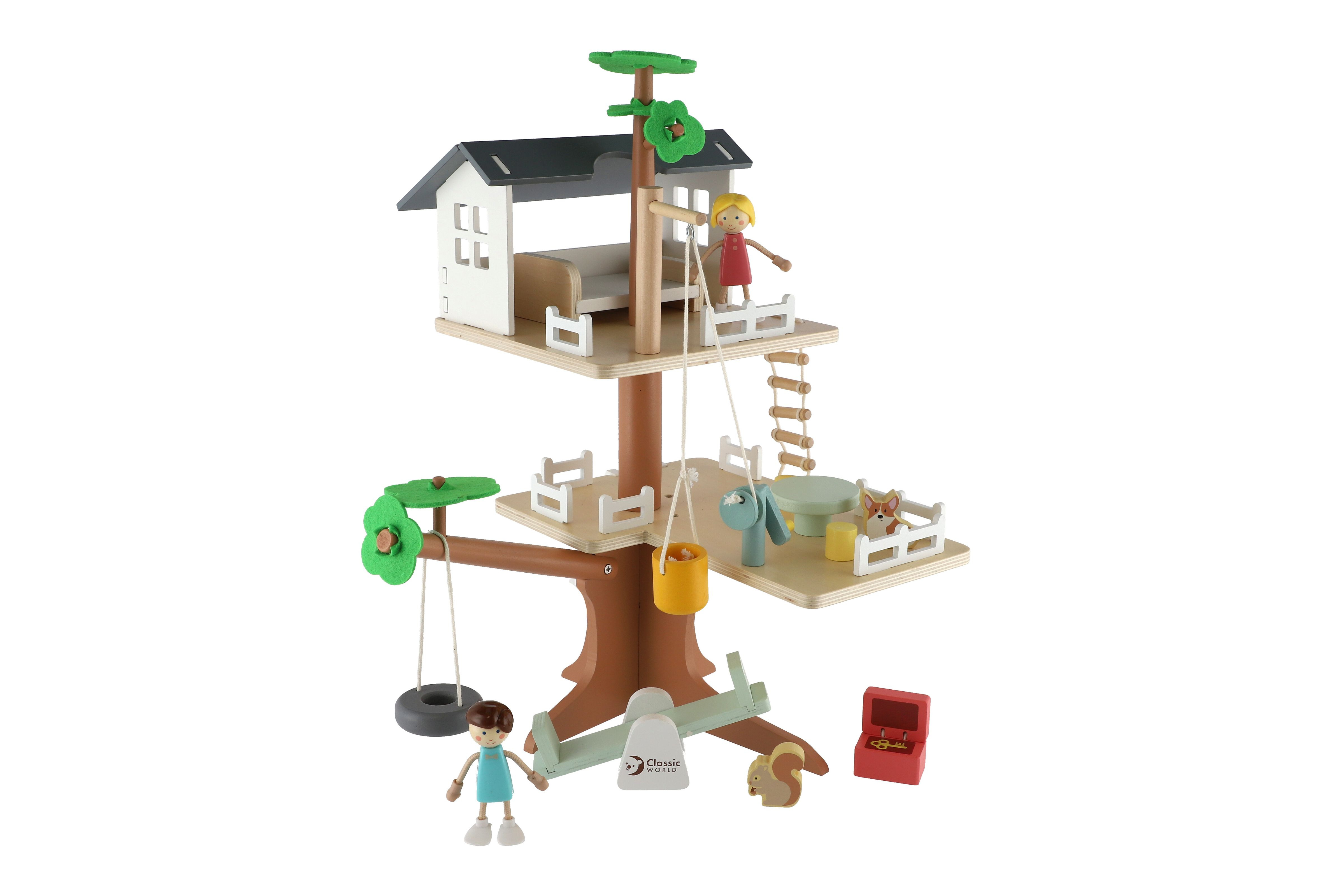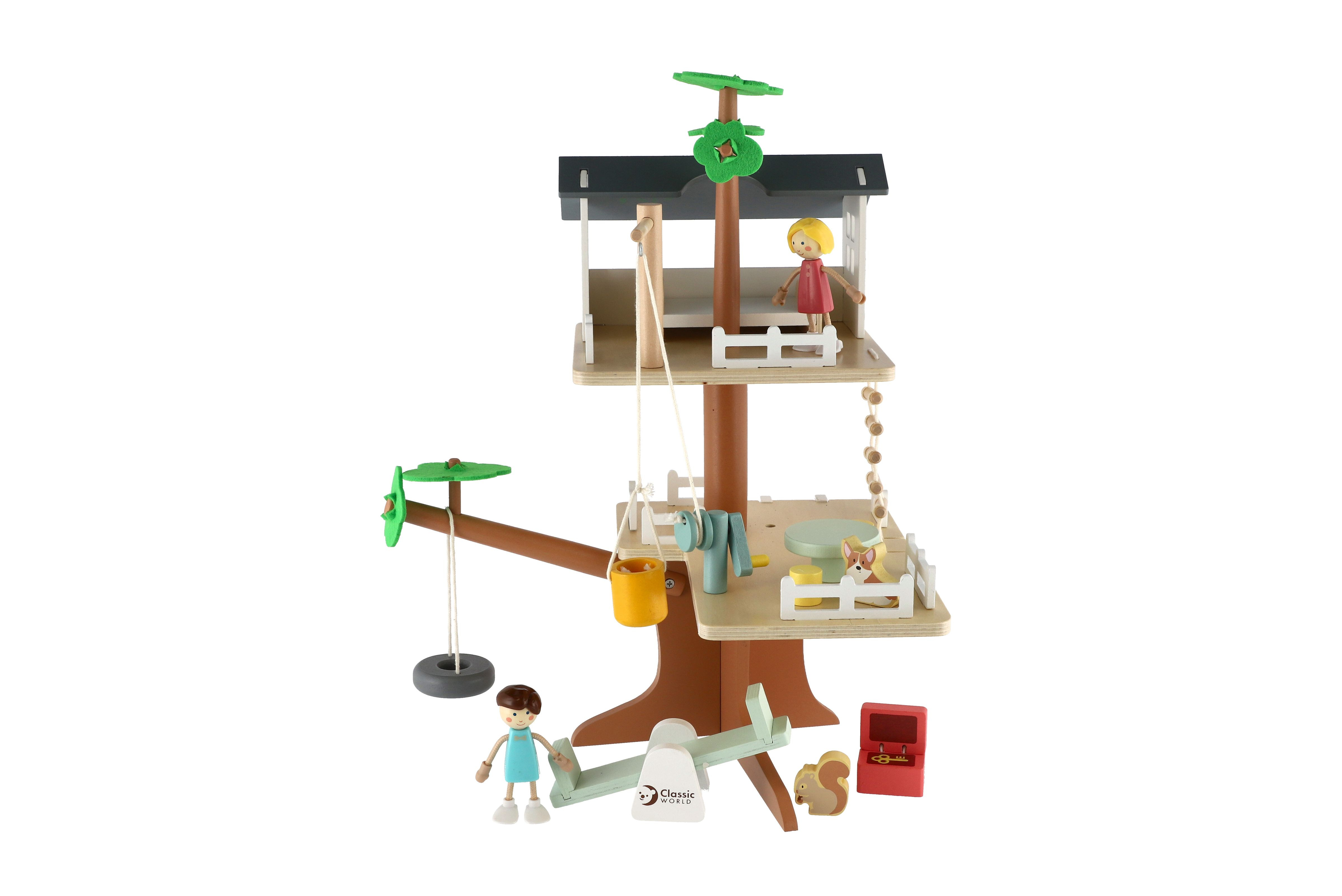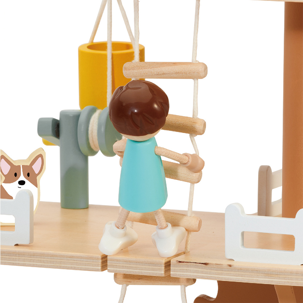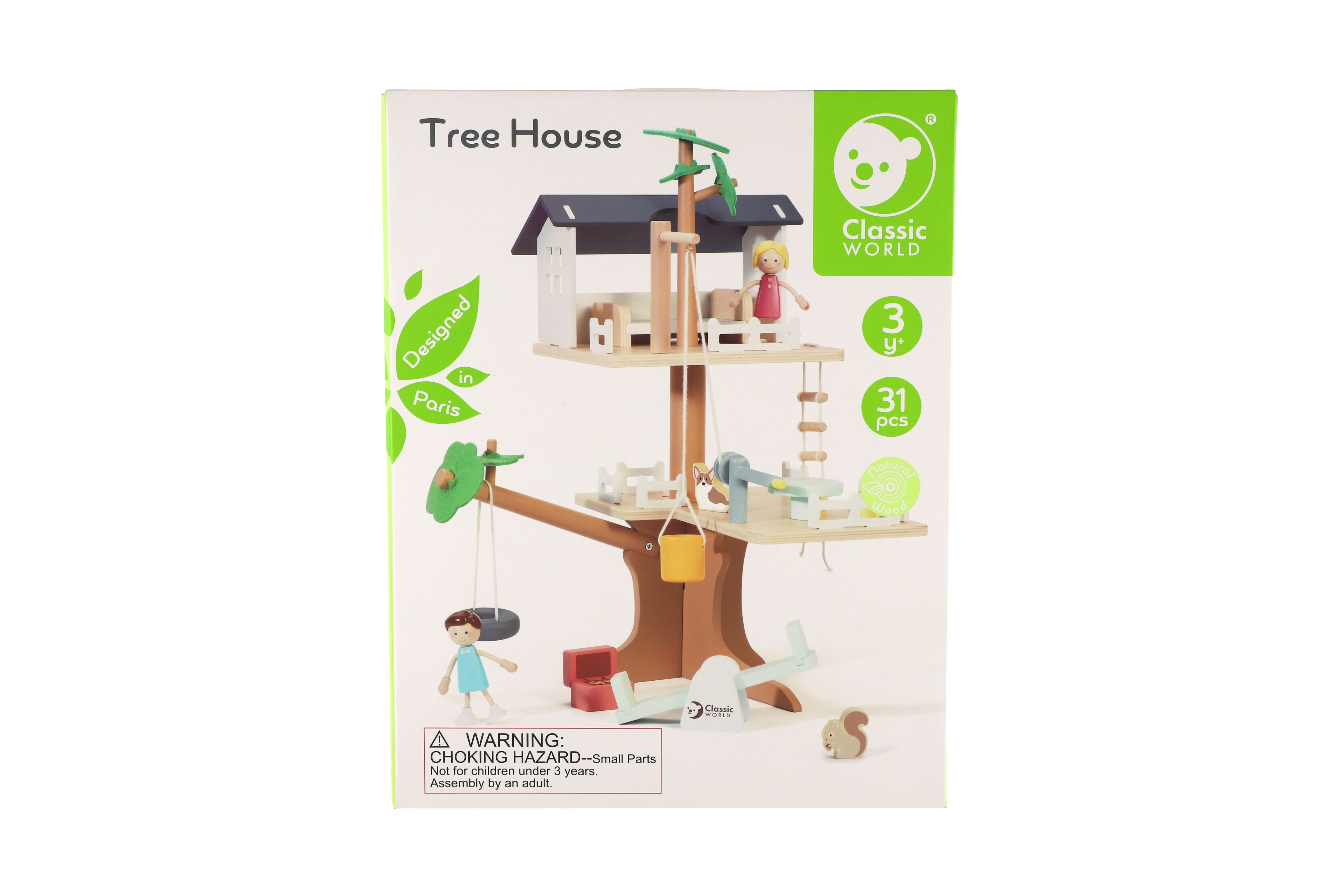 Děti si mohou postavit dům na stromě se mnoha doplňky. Balení obsahuje 2 figurky (chlapečka a holčičku), figurku psa, veverku houpačky, kladku, vědro, truhlu s pokladem, postel, stůl a židle. Pomocí klady mohou děti vyzvednout vědro až do koruny stromů. Balení obsahuje 31 dřevěných dílků. Rozměr krabice: 29 x 36 x 11 cm Vhodné pro děti od 3 let