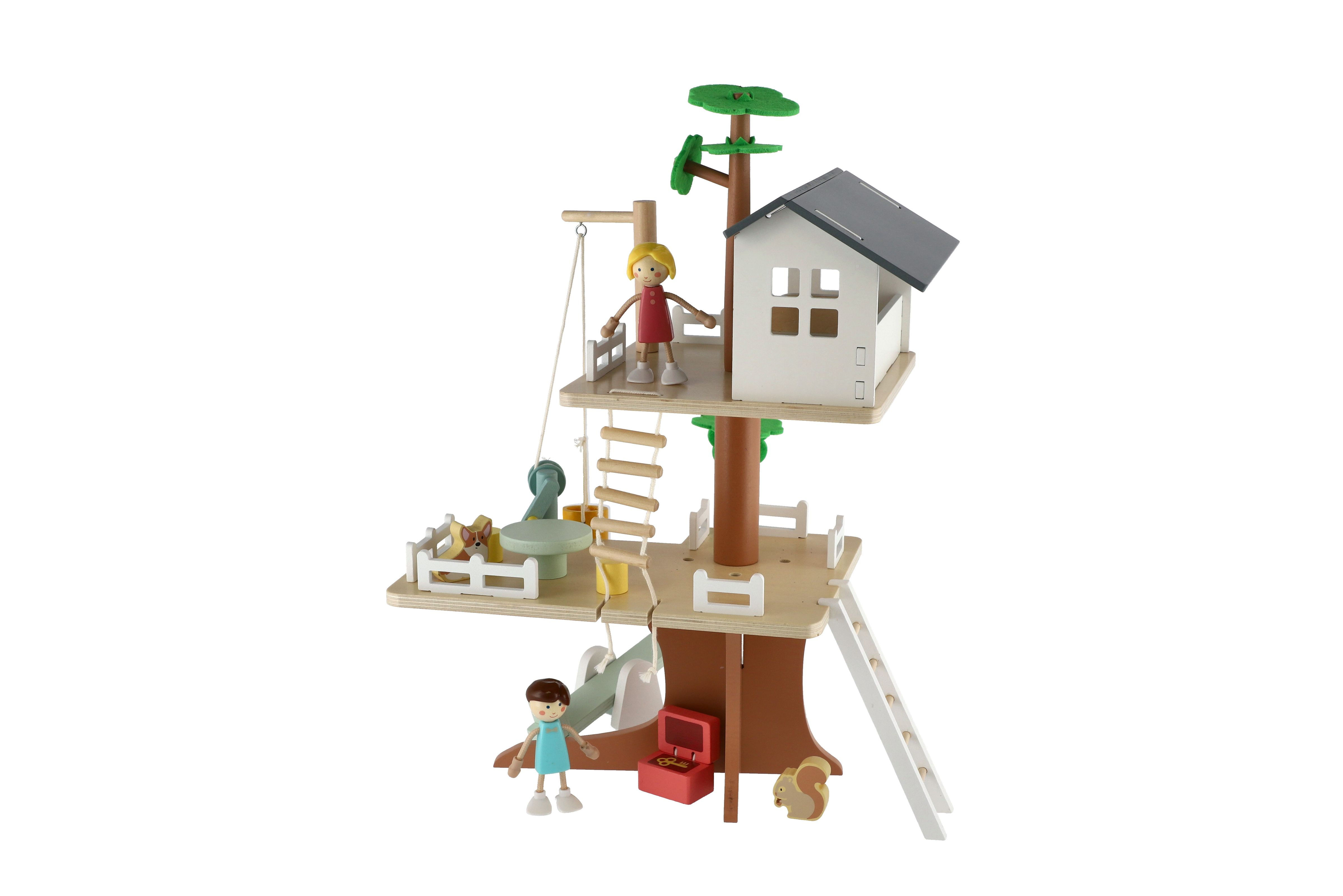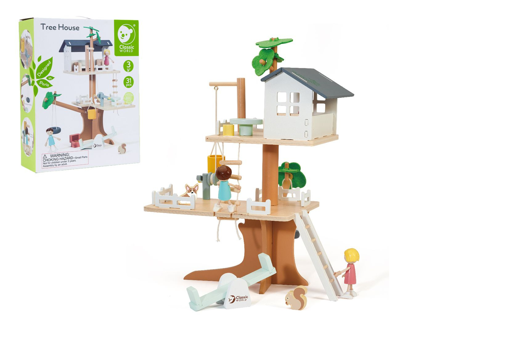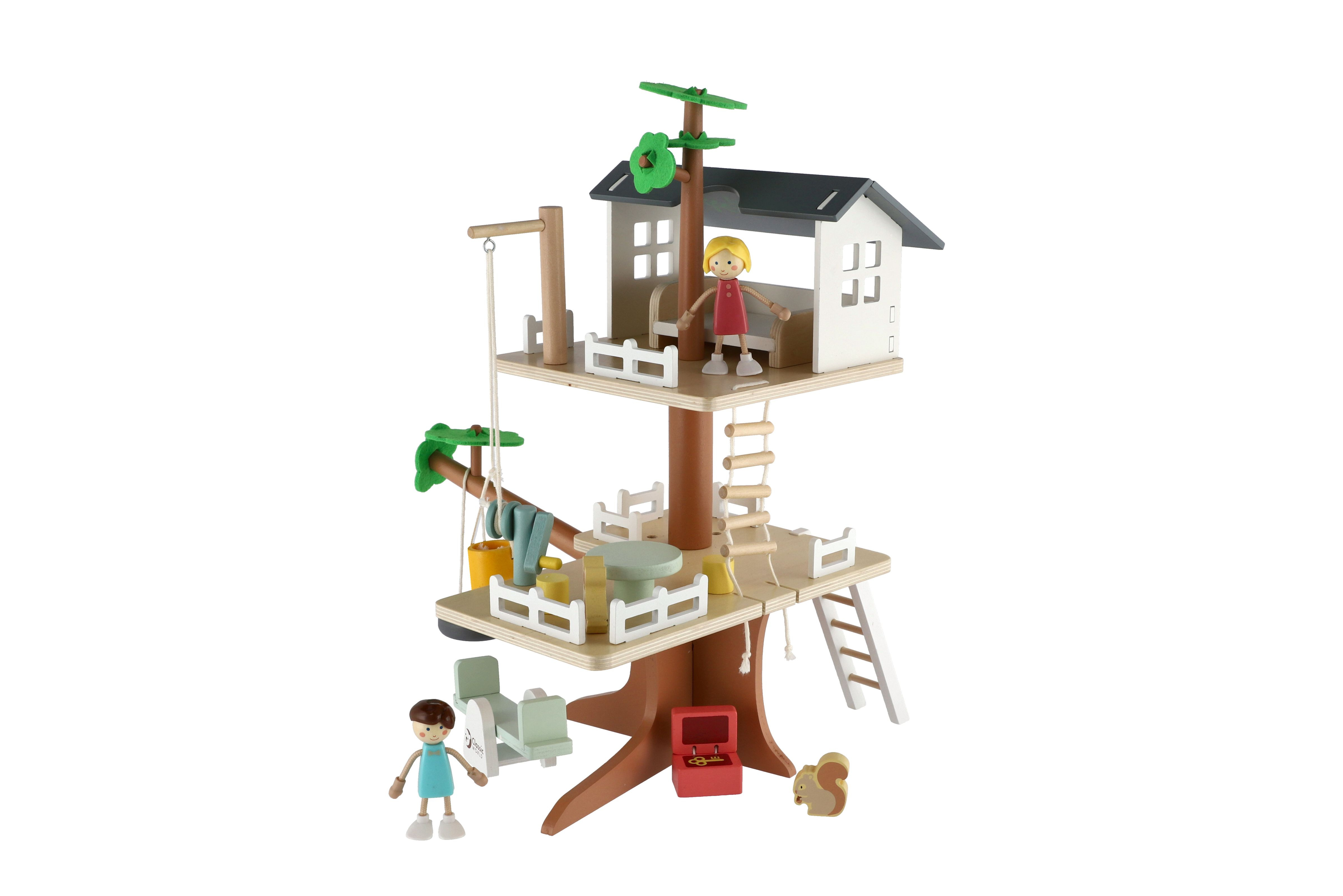 Děti si mohou postavit dům na stromě se mnoha doplňky. Balení obsahuje 2 figurky (chlapečka a holčičku), figurku psa, veverku houpačky, kladku, vědro, truhlu s pokladem, postel, stůl a židle. Pomocí klady mohou děti vyzvednout vědro až do koruny stromů. Balení obsahuje 31 dřevěných dílků. Rozměr krabice: 29 x 36 x 11 cm Vhodné pro děti od 3 let