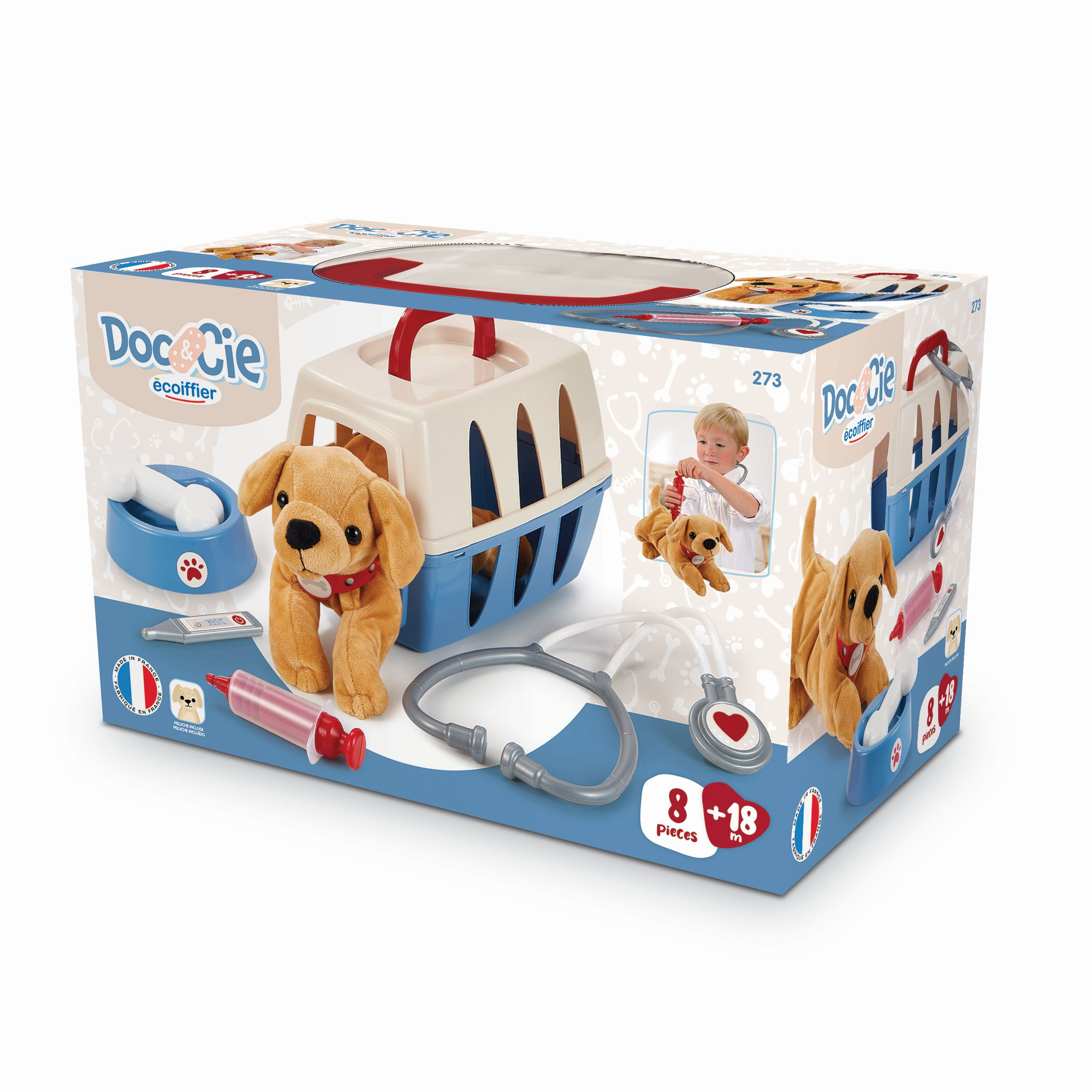 Kufřík pro malého veterináře s příslušentvím a pejskem. Kufřík lze použít jako přepravní box pro pejska a také pro uskladnění příslušentví. Součástí je miska pro pejska, kost, lékařské vybavení (teploměr, stříkačka, stetoskop). Rozměry kufříku: 24 x 15 x 14 cm.