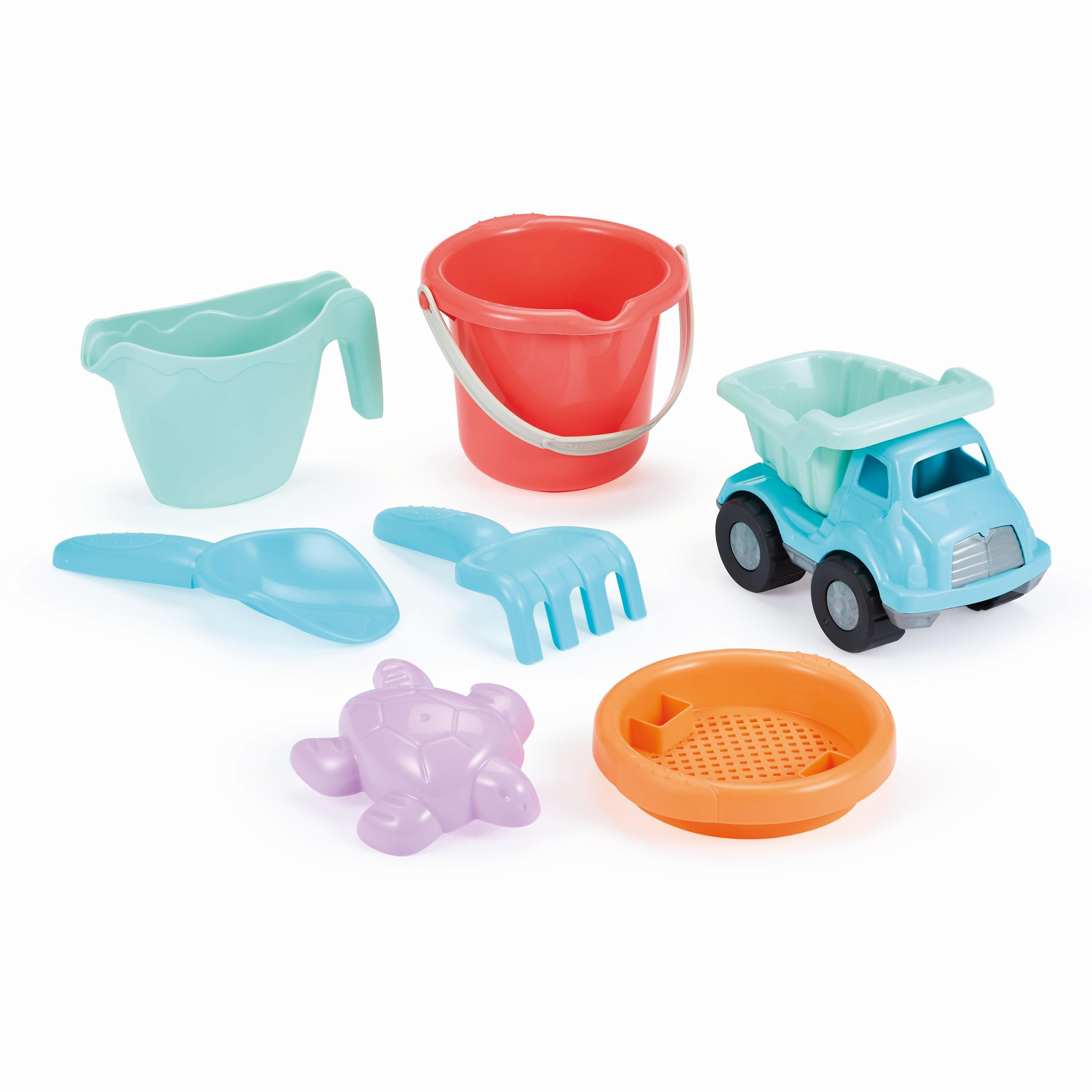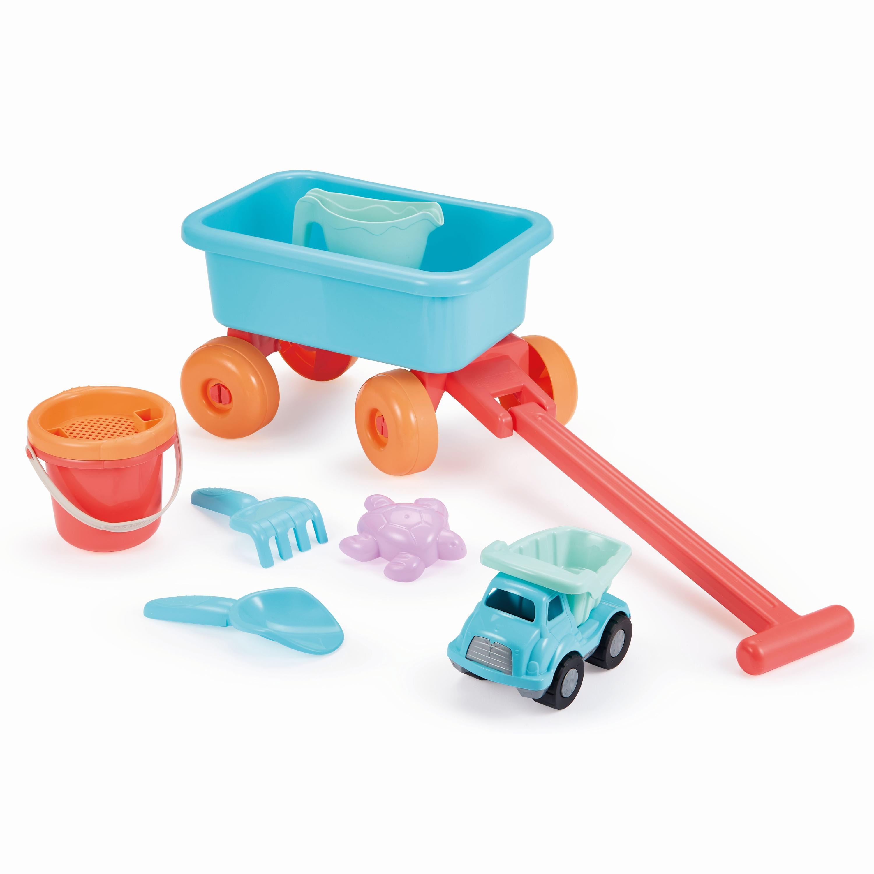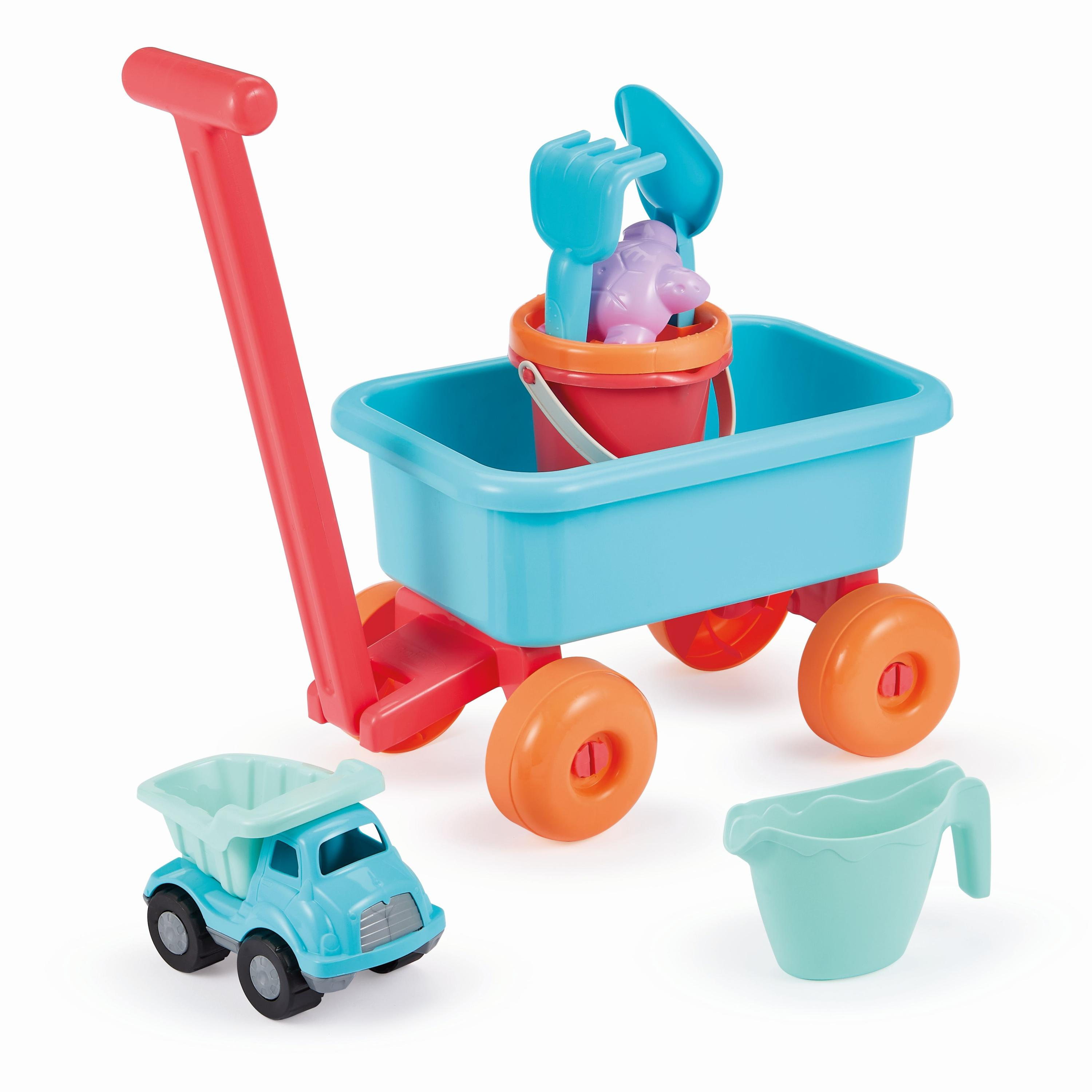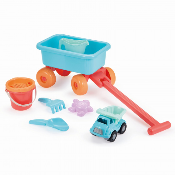 Snadno ovladatelný vozík s otočnou rukojetí. Vozík obsahuje kyblíček na písek o průměru 12 cm se sítkem. Součástí je lopatička, hrabičky, konvička na zalévání, formička a malé autíčko. Ideální na pískoviště nebo na pláž. Rozměry 69,5 x 20 x 20,5 cm.