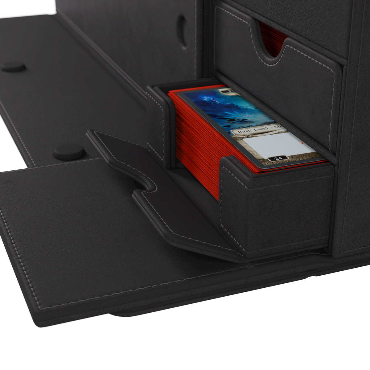 • Navrženo až pro 400 karet v dvojitých obalech nebo 540 karet v jednom obale. • Perfektní pro turnajové hráče, herní večery s karetními hrami jako Pokémon™, Marvel Champions, Arkham Horror LCG™, KeyForge®, nebo Terraforming Mars™ • 2 extra přihrádky • 2 vyjímatelné šuplíky na žetony, kostky, obalené karty nebo celé balíčky • Každý šuplík pojme 40 karet v dvojitých obalech nebo 50 v jednom obale. • Revoluční magnetické klapky zajišťují snadné vysouvání přihrádek