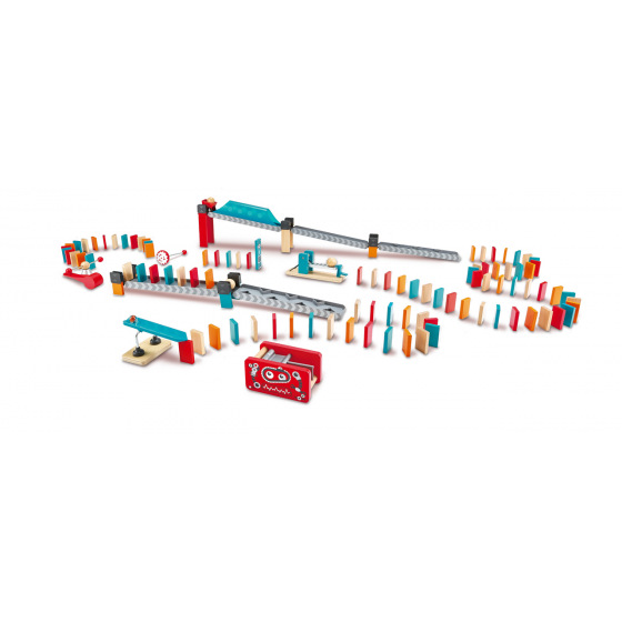 Vytvorte si pestrú cestu zo 100 ks dreveného domina. Ako doplnok je tu zvonček, koľajnice a ďalšie drobnosti. Potom už stačí len strčiť do jedného dielika a sledovať, ako sa všetko postupne položí. Neplatia tu žiadne pravidlá - domino nemožno postaviť dobre alebo zle. Preto hra detí baví - je to priestor pre ich fantáziu a predstavivosť. Hračka rozvíja jemné motorické zručnosti, podporuje obratnosť a koordináciu rúk a očí. Veková kategória: 3+ Veľkosť balenia: 76,2 x 22,9 x 61cm
