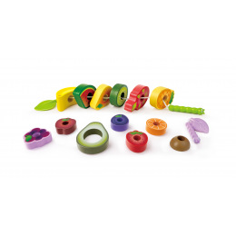 Sada s čerstvou zeleninou nadchne chlapcov aj dievčatká! Vďaka ukrytému suchému zipsu je možné zeleninu pomocou priloženého noža krájať a mať tak oveľa realistickejší zážitok z hry. Balenie obsahuje 6 druhov ovocia a drevený nôž. Hračka rozvíja detskú fantáziu a predstavivosť. Rozvíja jemnú motoriku a koordináciu očí a rúk. Vyrobené z kvalitného a odolného dreva. Vek: 3+. Rozmer: 20 x 6 x 26 cm.