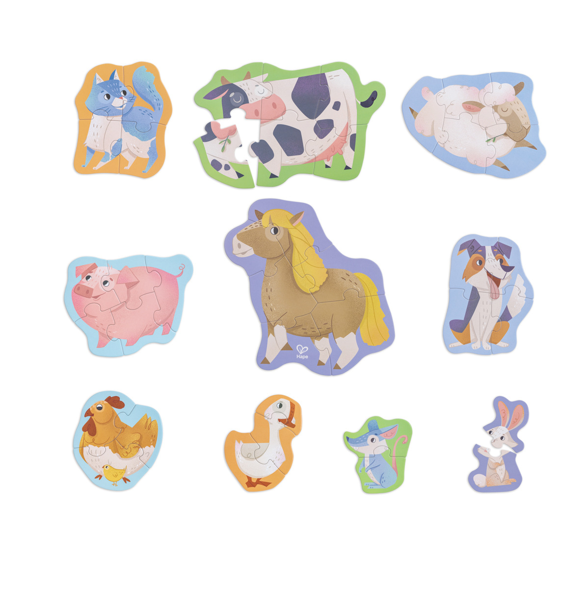Oživte hospodárske zvieratá s našou nádhernou zbierkou puzzle. Zapojte sa do hodín vzdelávacej a zábavnej hry s týmito očarujúcimi postavičkami z dvora. Táto sada puzzle obsahuje desať rozkošných skladačiek so zvieratkami z dvora v tvare prasiatka, kurčaťa, mačky, kačice, ovce, myši, kravy, králika, kozy a kone. Keď deti manévrujú s hlavolamom a snažia sa poskladať rôzne dieliky, rozvinú si kľúčové zručnosti, ako je základné rozpoznávanie vzorov, koordinácia ruka-oko a riešenie problémov. Rozmer balenia: 36x6x18 cm. Vek 18m+