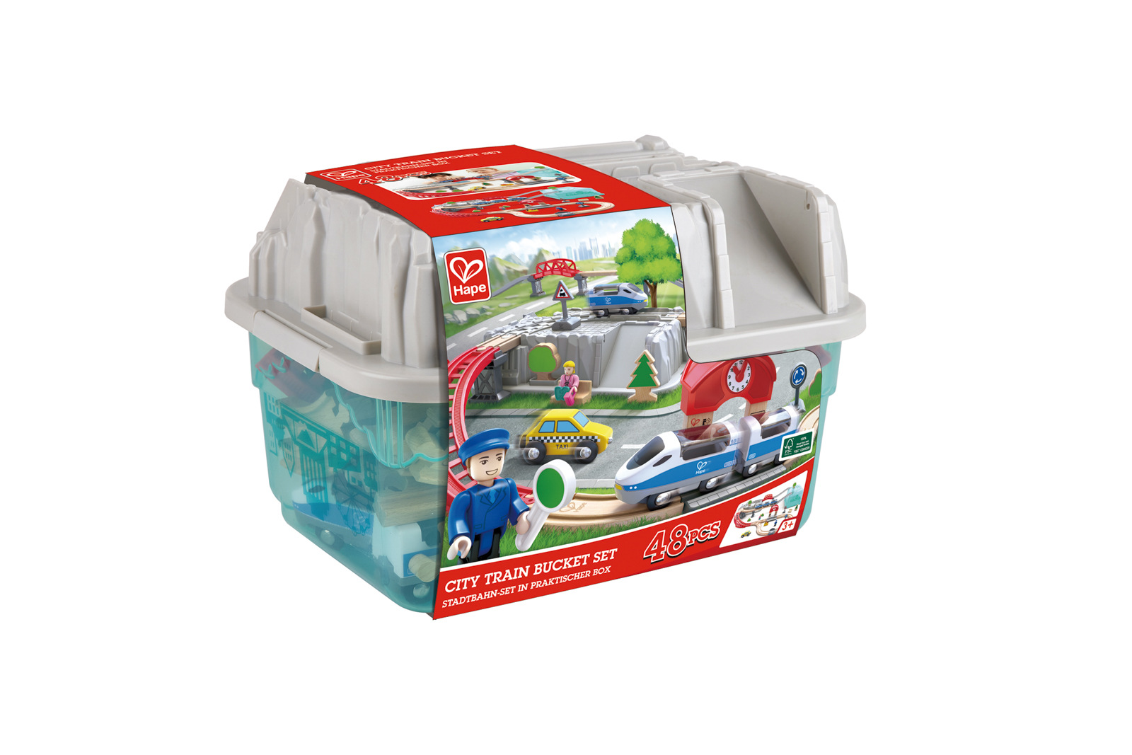 Užijte si zábavné dobrodružství při jízdě vlakem přes vzestupy a pády po městě! Tato sada kbelíků vhodná pro cestování je plná doplňků, jako jsou stromy, značky a auta. Tato nádherná sada je dodávána v úložném boxu, který ve skutečnosti tvoří součást scenérie! Balení: 23,5x21,5x32cm. Věk: 3+