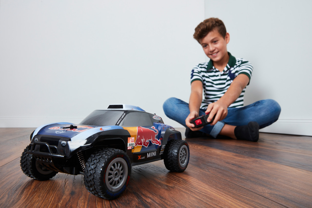 Dvojkanálový model auta na diaľkové ovládanie X-Raid MINI JCW Buggy Red Bull 1:16, frekvencia 2,4 GHz. Súčasne môže jazdiť až 10 jazdcov. 30,5 x 11,5 x 17 cm.\Na autobatériu 4 x LR6 AA (1,5 V), vodič 1x 6LF22 (9 V).