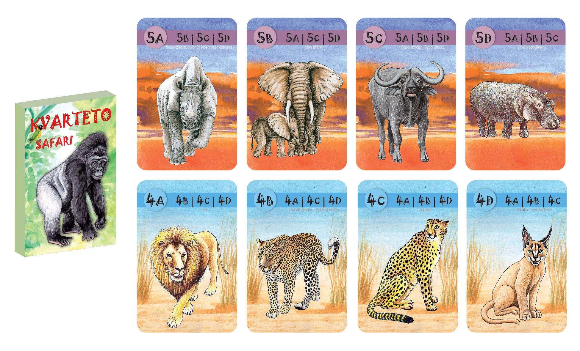 Detské karty pre hru zvanú Kvarteto s obrázkami Safari. Krabička obsahuje aj podrobný návod a karty majú na rubovej strane mierne zdrsnený povrch pre lepšiu manipuláciu s nimi.