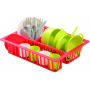 Velká sada nádobí s odkapávačem obsahuje hrníčky, příbory, talíře, hrnec s poklicí, konvičku s pokli