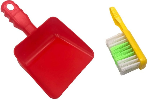 Sada pro úklid se skládá z ručního smetáku, lopatky a velkého koštěte. S touto barevnou úklidovou sa