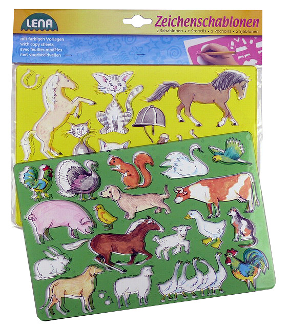Šablóny na kreslenie s motívom koní a mačiek. Balenie obsahuje dve šablóny. Veľkosť šablón 27x23 cm.