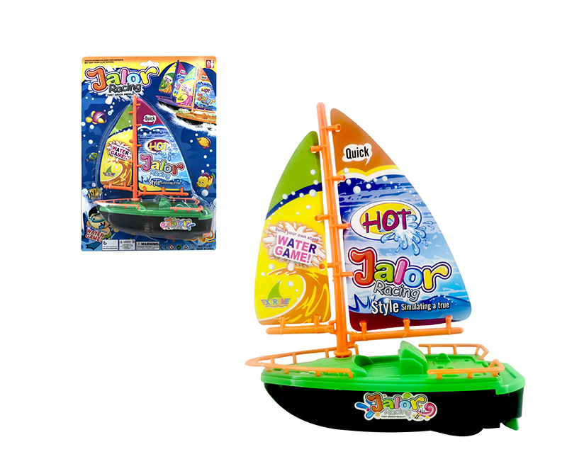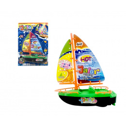 Farebná plachetnica na batérie, ktorá pláva na vode.